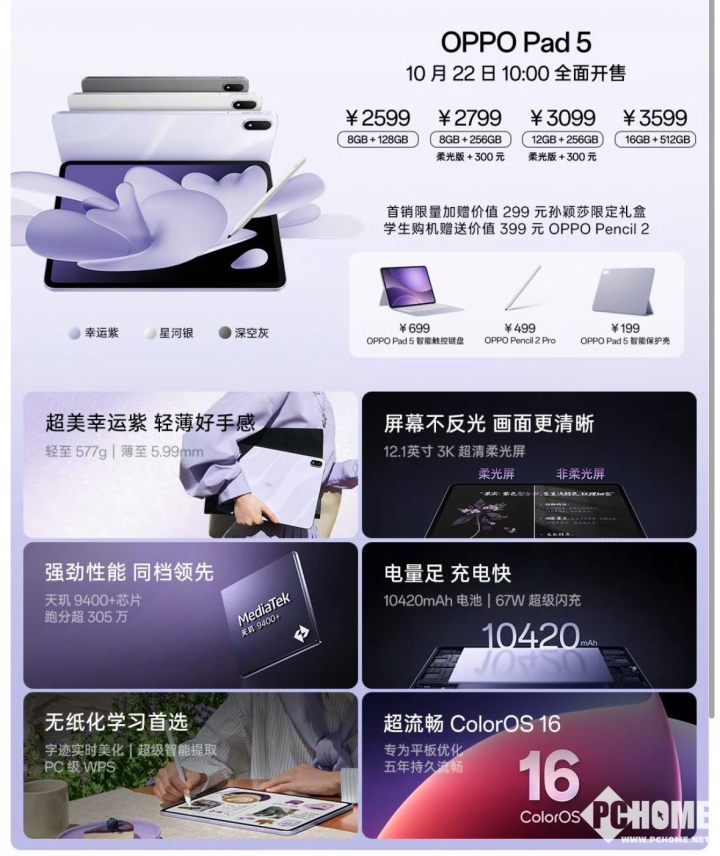 全新的OPPO Pad 5搭载了12.1英寸3K超清护眼屏,柔光版能有效消除97%的环境干扰光;屏幕轻至577g,薄至5.99mm。性能方面,OPPO Pad 5搭载了天玑9400+芯片,跑分突破305万,并且OPPO Pad 5搭载了10420mAh大电池,支持67W快充,电量足且充电快。