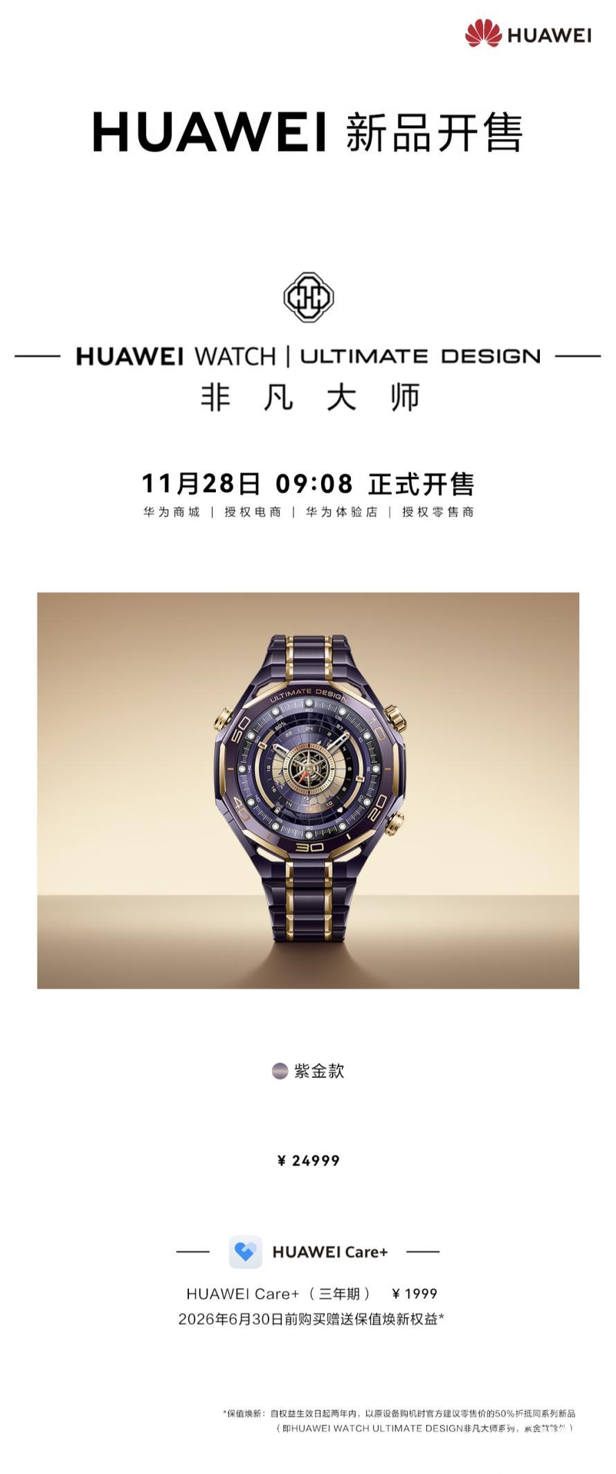 2025年11月28日,华为WATCH ULTIMATE DESIGN 非凡大师紫金款正式开售,售价为24999元。