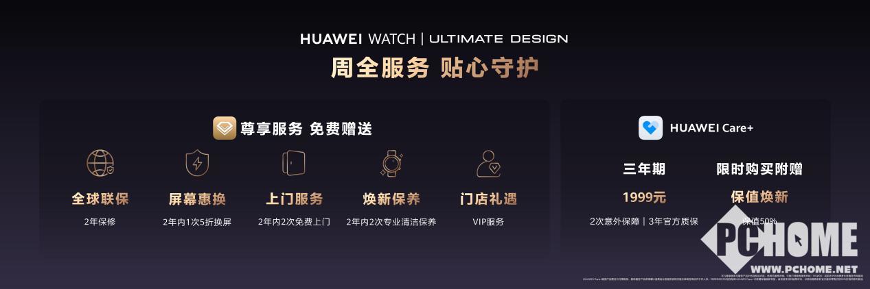 可随新机搭配购买HUAWEI Care+综合保障服务产品,为您提供3年2次意外保障及3年官方质保,并且还限时(2026年6月30日之前)赠送保值焕新权益,权益生效之日起两年内(生效之日起至第24个月底止),若原设备满足保值焕新回收标准,即可享受原设备在购买时的官方建议零售价的50%折抵优惠,购买HUAWEI WATCH ULTIMATE DESIGN同系列新机(不含本机,不含Ultimate非凡探索系列)。