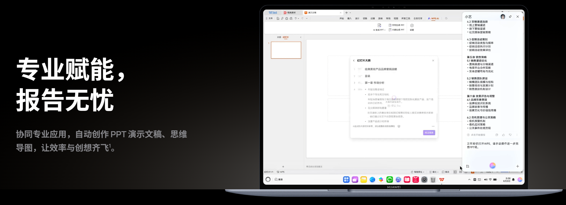 系统内置独立的“企业空间”与“个人空间”,通过 “四指一划”手势,流畅切换空间,企业空间运行业务,个人空间处理私人事务。搭载盘古大模型能力,支持企业部署专属AI助手小艺,支持空间间文件传输,可在高效保障数据隐私前提下实现高效生产力工具,例如 “一句话生成PPT/报告”。