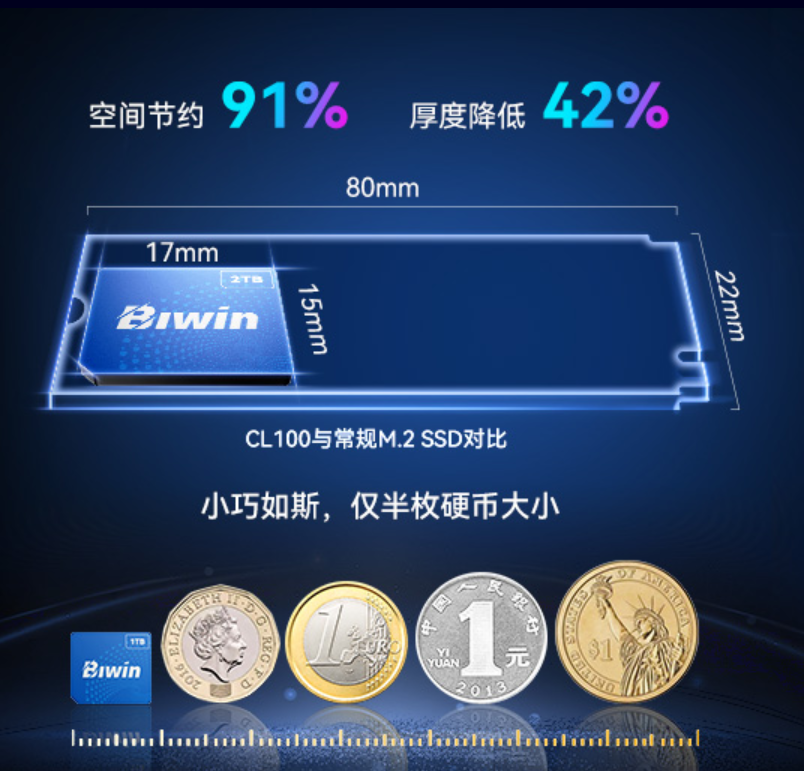 这款Mini SSD的尺寸为15.0mm×17.0mm×1.4mm,重量约1克,整体大小仅相当于半枚硬币,小巧体积下却蕴藏强劲性能。硬件规格上,佰维CL100搭载PCIe 4.0x2接口,兼容NVMe1.4协议,同时配备动态模拟SLC缓存技术以提升读写表现,其连续读取速度可达3700MB/s,连续写入速度达3400MB/s;1TB、2TB版本的随机读取IOPS可达550K,随机写入IOPS可达650K。