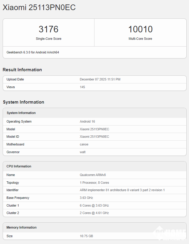 一款型号为25113PN0EC的小米手机,出现在了Geekbench跑分平台,这款手机被认为是小米 17国际版。根据跑分信息显示,该机采用Android 16系统,配备了12GB RAM内存,搭载第五代骁龙8至尊版处理器,单核跑分为3176分,多核跑分为10010分。