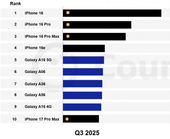 值得注意的是,在Q3季度仅发售18天(含预售)的iPhone 17 Pro Max,成功挤进了畅销榜的前十,虽然该机仅排在第十,但已经足够表明该机在市场中的强势表现了。