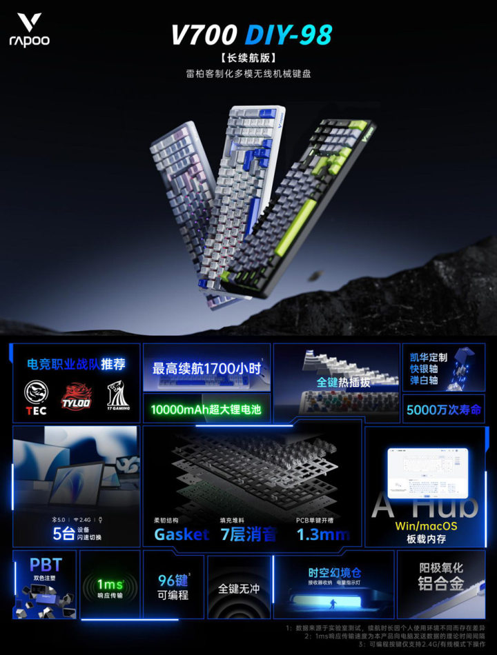 一次充电,玩够半年,告别几天一充时代,这不仅是技术堆砌,更是对用户真实痛点的回应。V700DIY-98长续航版内置10000mAh大容量锂电池,搭配雷柏新升级低功耗无线技术,让续航得到跨越式提升,使用USB-C接口单次充满电最长可连续使用1700小时,从此续航无忧。