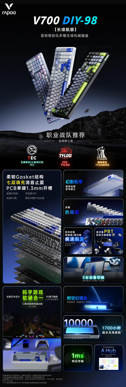 告别续航焦虑,机械键盘体验全方位进化。雷柏V700DIY-98长续航版客制化多模无线机械键盘,以单次满电可连续使用1700小时为核心突破,融合7层消音Gasket结构带来的纯净HIFI按键声效,提供两种疾速触发机械轴体,支持三模多设备连接,为游戏玩家与办公用户提供持久、干净无杂音、多设备协同的无线客制化解决方案。