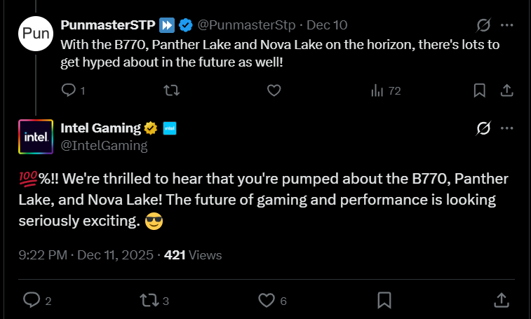 根据媒体截图,英特尔官方账号表示:“100% 会出现!感受到你对B770、Panther Lake和Nova Lake的热切期盼,我们深感高兴!我们未来在游戏和性能方面的表现,将值得期待。”