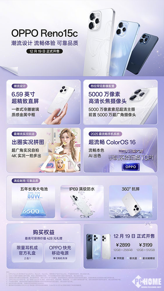 配置方面,Reno15c配备了6500mAh五年长寿大电池+80W闪充,搭载ColorOS 16系统,提供流畅使用体验。还支持IP69级满级防水与360° 抗摔,带来全面而安心的品质保障。