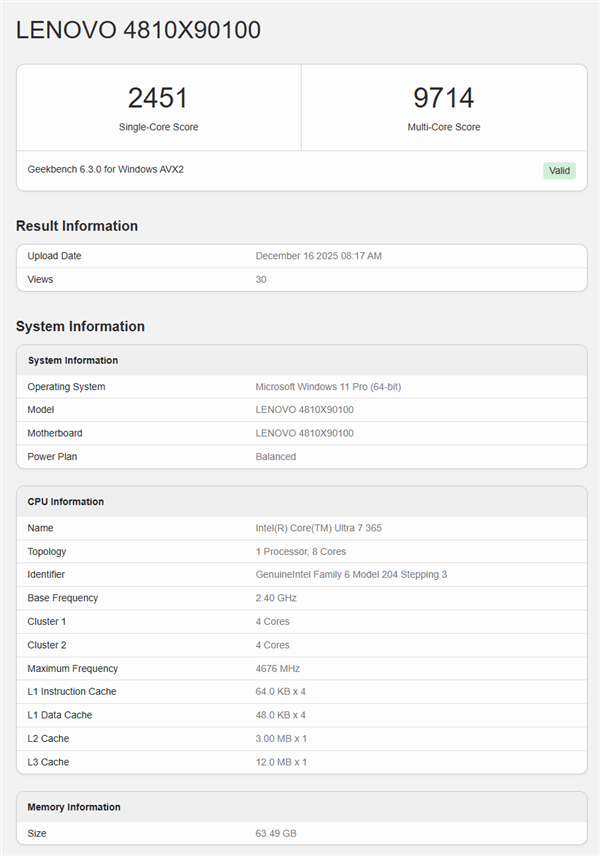 距离Intel新一代Panther Lake处理器正式上市日益临近,该系列新品近期开始频繁亮相。近日,系列中的酷睿Ultra 7 365型号,在Geekbench测试中曝光了初步跑分数据:单核测试得分2451分,多核测试得分9714分。