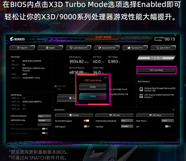 通过技嘉BIOS界面可一键开启X3D Turbo模式,可自动优化CPU频率、降低系统延迟,一键暴涨游戏帧数,让游戏运行更流畅;配合主板所采用的抗干扰PCB设计,有效减少信号干扰,避免高负载游戏时出现蓝屏、卡顿,保障运行稳定性,让游戏体验更可靠。