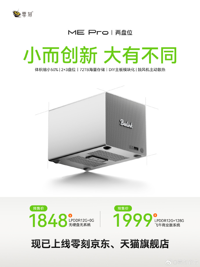 零刻ME Pro NAS型迷你主机今日正式开启预售,采用上部双3.5"硬盘舱+下部主板舱的设计,首发版本仅标配英特尔N95处理器和12GB LPDDR5内存,可选基础版或商业版,以全球最小双盘位机身和模块化可升级设计引发热议。