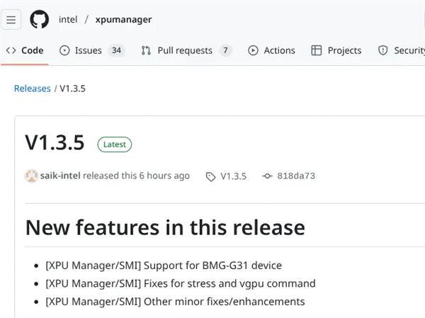 根据科技媒体Phoronix于12月17日发布博文报道,Intel官方工具XPU Manager的最新1.3.5版本更新日志中,已明确加入对代号“BMG-G31”芯片的官方支持。