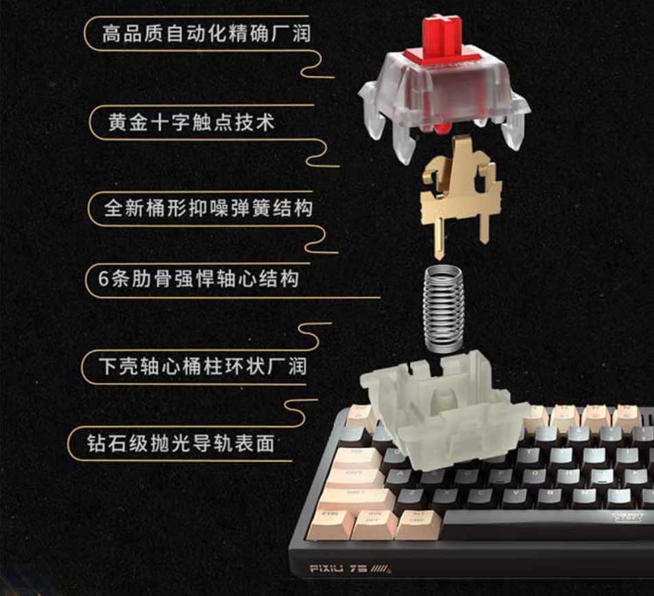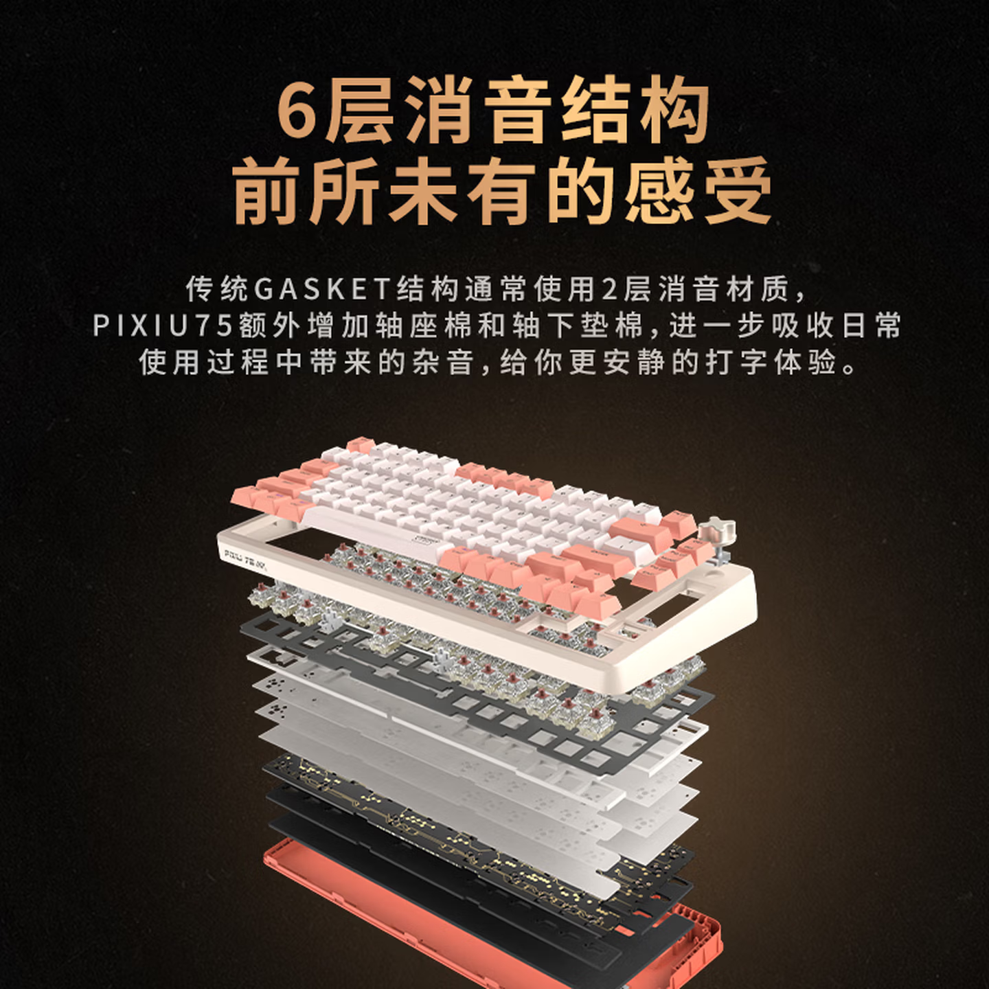 这款CHERRY PIXIU75键盘是一款客制化无线三模电竞机械键盘,整体采用75%配列(81键)设计,能节省大约30%的桌面面积。推出了多种主题款式,如混天绫、金箍棒、宝可梦大乱斗主题礼盒、蔚蓝档案联名,键盘配备独特的貔貅旋钮,做工精致,兼具实用性与装饰性。
