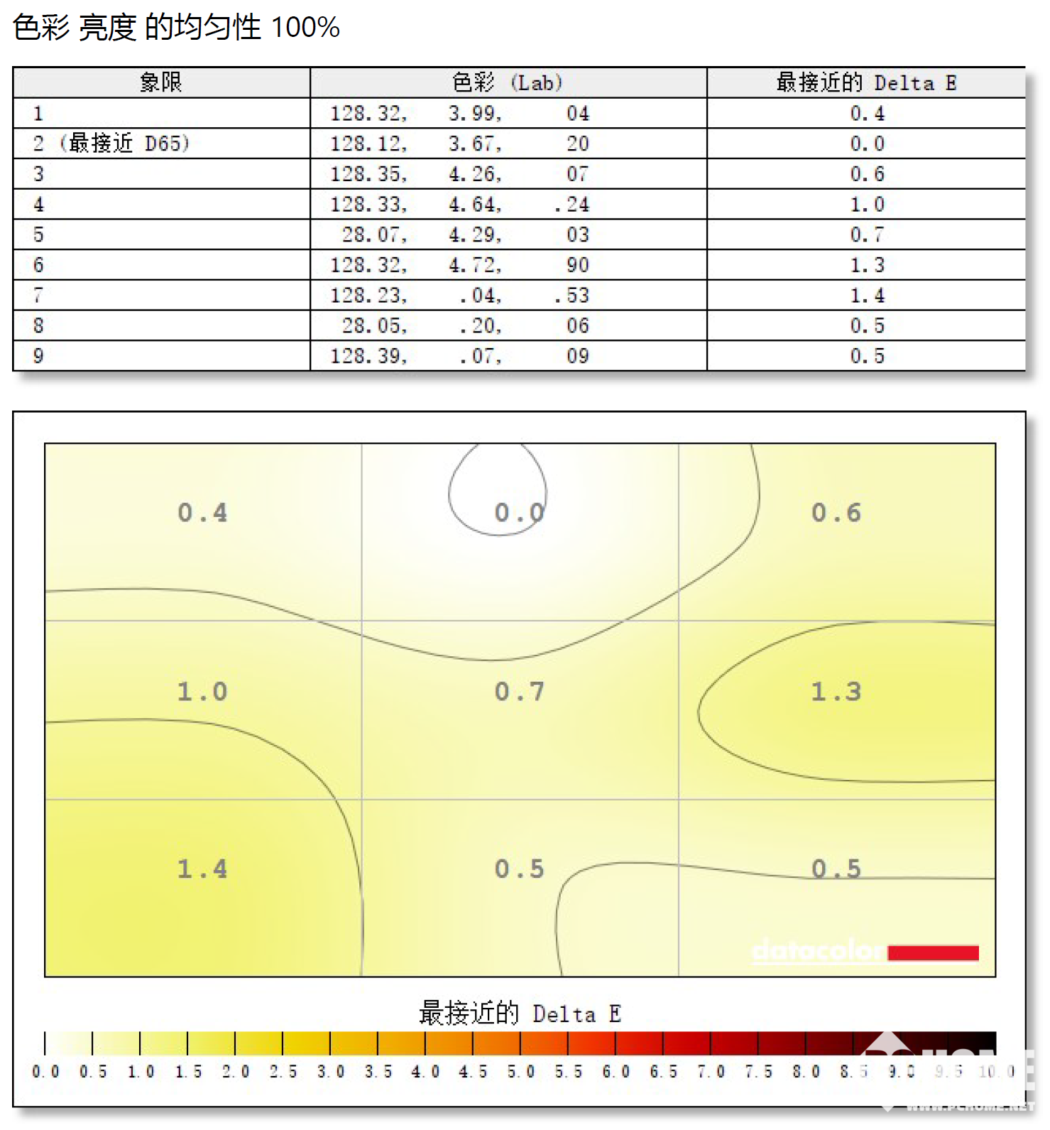在色彩亮度均匀性方面,100%亮度下,AW3425DW显示器的第二象限最接近D65标准,屏幕第六和第七象限和标准色温还是有一些差距,不过最大差值也仅有1.4。作为一款曲面显示器,能有这样的色彩匀称性已经是相当不错了。