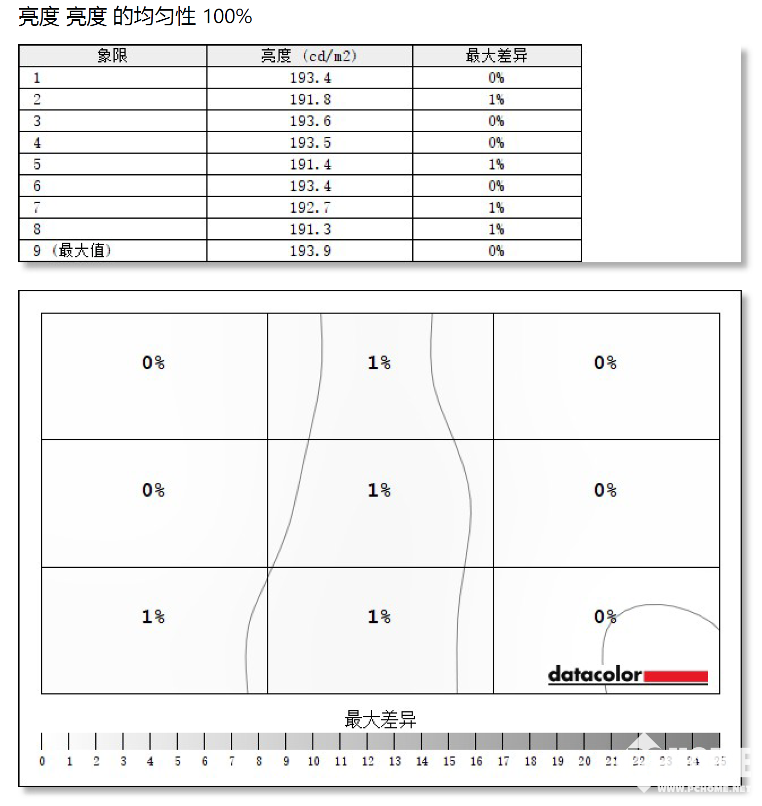 在亮度匀称性方面,整块屏幕九个象限最大差异仅有1%,背光控制的十分不错,平均亮度在192尼特左右,在34英寸这么大面板的情况下,AW3425DW能取得这样的亮度匀称性表现是十分出色的表现了。