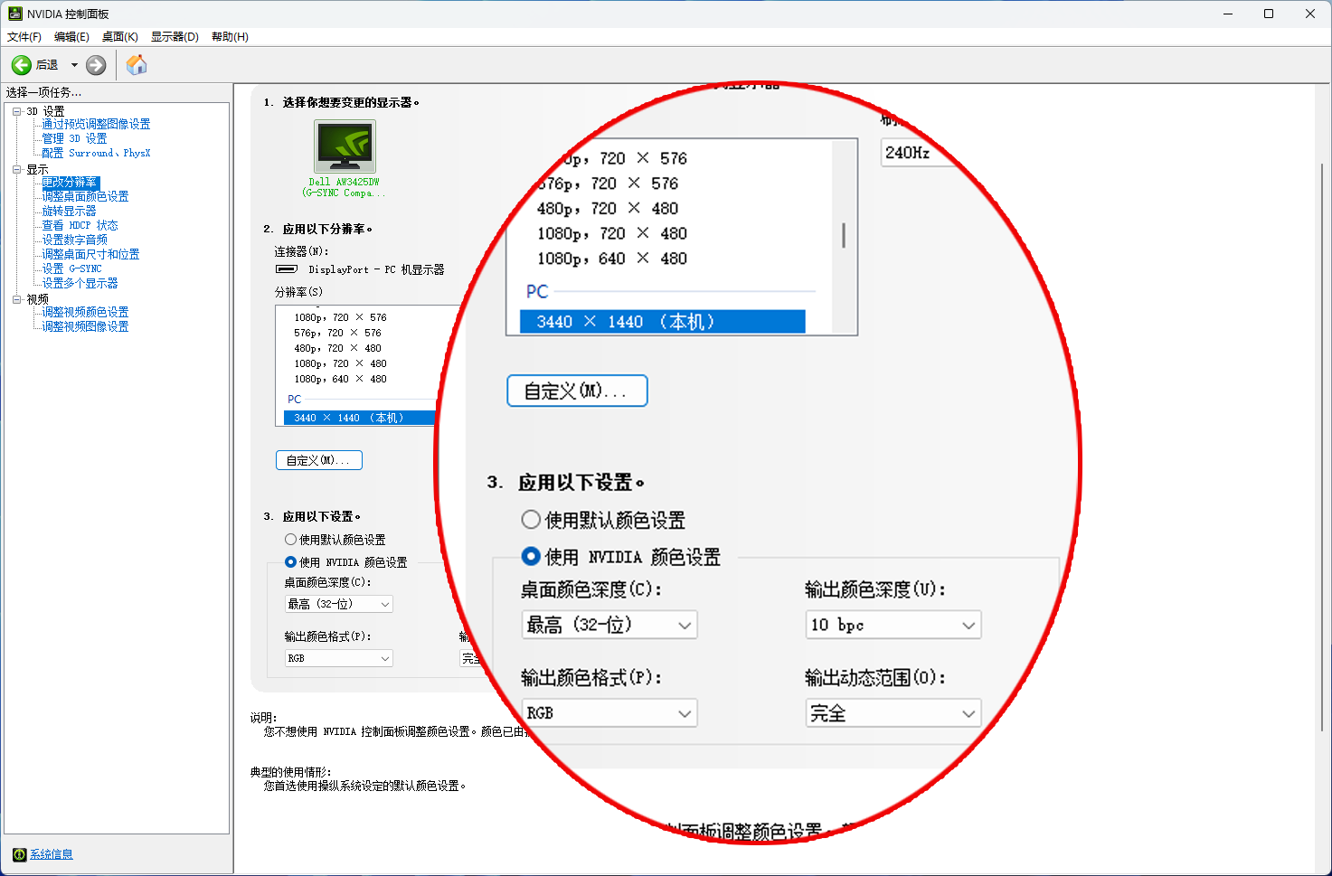 AW3425DW支持10bit色深,经过我们实测,通过DP 1.4接口可以实现最高3440*1440分辨率、240Hz刷新率、RGB颜色格式、10bit色彩、完全动态范围的满血输出,用户在实际使用的时候可以同时拉满所有参数,不必再在分辨率、色深、刷新率之间做选择。