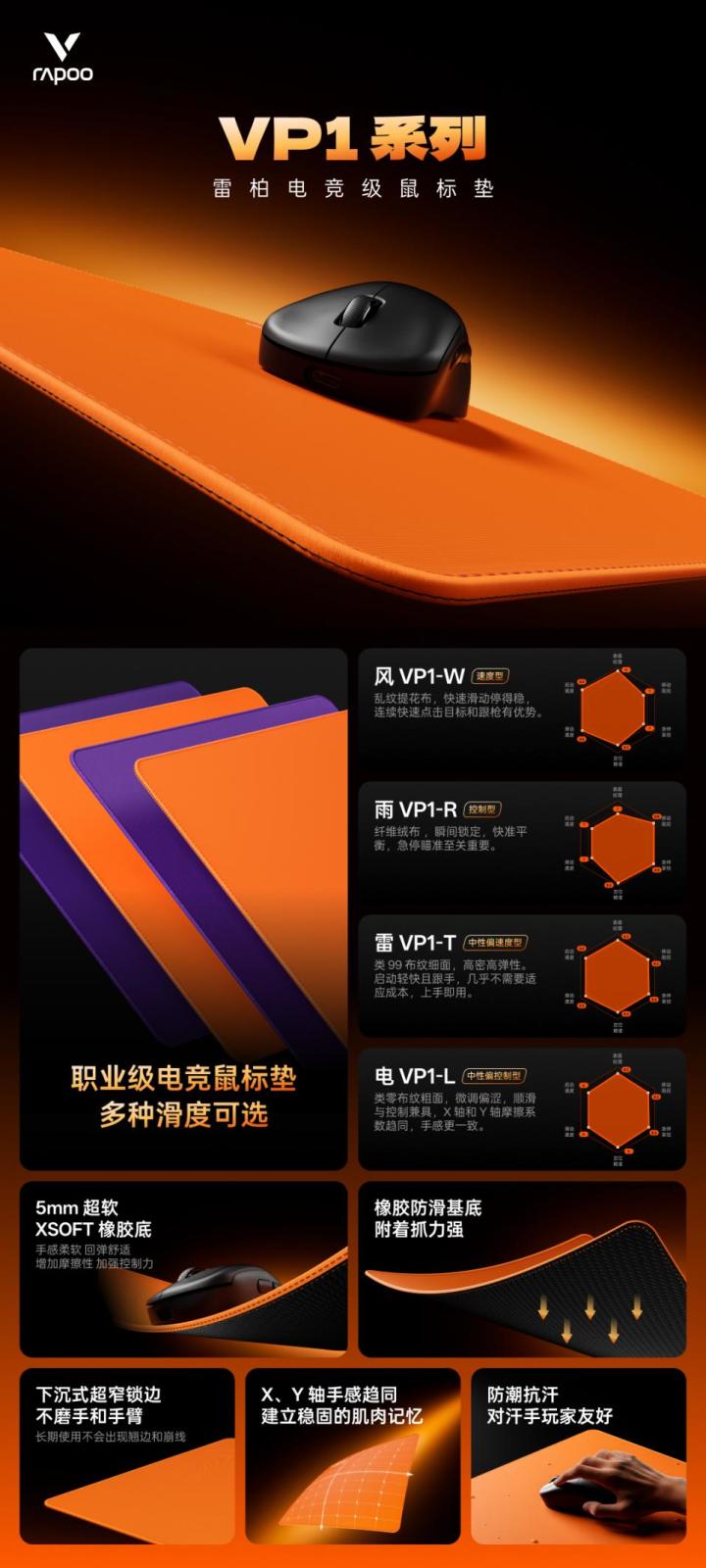 全新VP1系列职业电竞鼠标垫,以 “风、雨、雷、电”四种专属表面,表面纹理、移动阻尼、急停掌控、定位精准、滑动速度、启动速度、表面纹理等6个维度塑造不同的滑垫、涩垫、中性垫。为普通游戏玩家以及专业电竞用户提供高质量赛事级桌面操控解决方案,进一步完善雷柏专业级别赛事外设生态版图,同时为电竞鼠标垫市场注入全新活力,“极致体验”、“日常享受”。