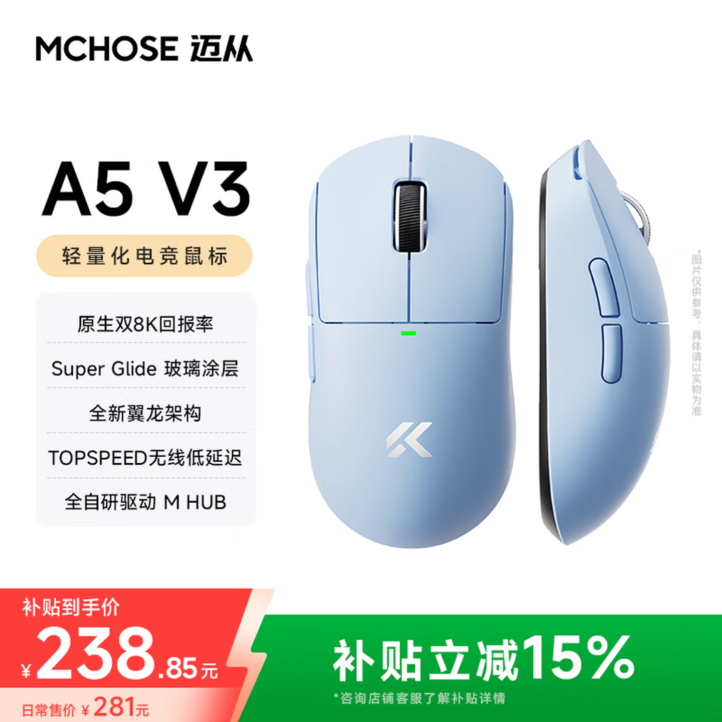 迈从A5 V3是一款主打性价比的轻量化游戏鼠标,整体尺寸约为121.6mm*61.5mm*37.7mm,重量为56g,长时间使用并不累手,适合中小手玩家使用。在类GPW万金油模具基础上进行了全面升级,采用重心居中对称设计,适合抓握、指握、趴握多种握姿。
