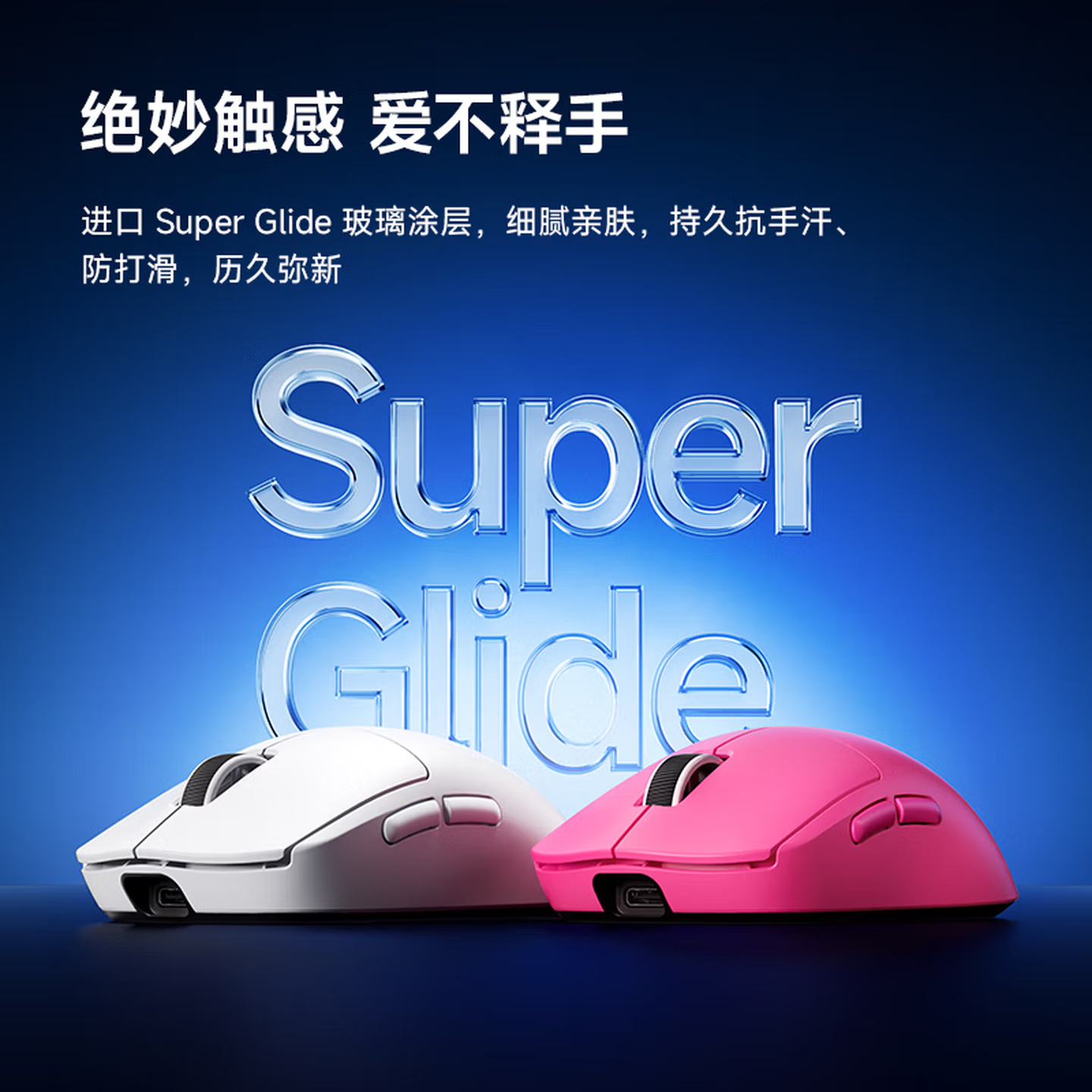 此型号的鼠标共有浆果红、白色、蓝色、黑色四色可选;涂层升级为进口SuperGlide玻璃涂层,触感温润如玉,比赛时不年兽,防滑防油耐磨;内置500mAh大电池,支持有线、2.4G无线、蓝牙三模连接;同时在底部设置罕见的电竞级PTFE大脚垫,无论哪种材质鼠标垫,都能让你随心选择,适配性非常高。