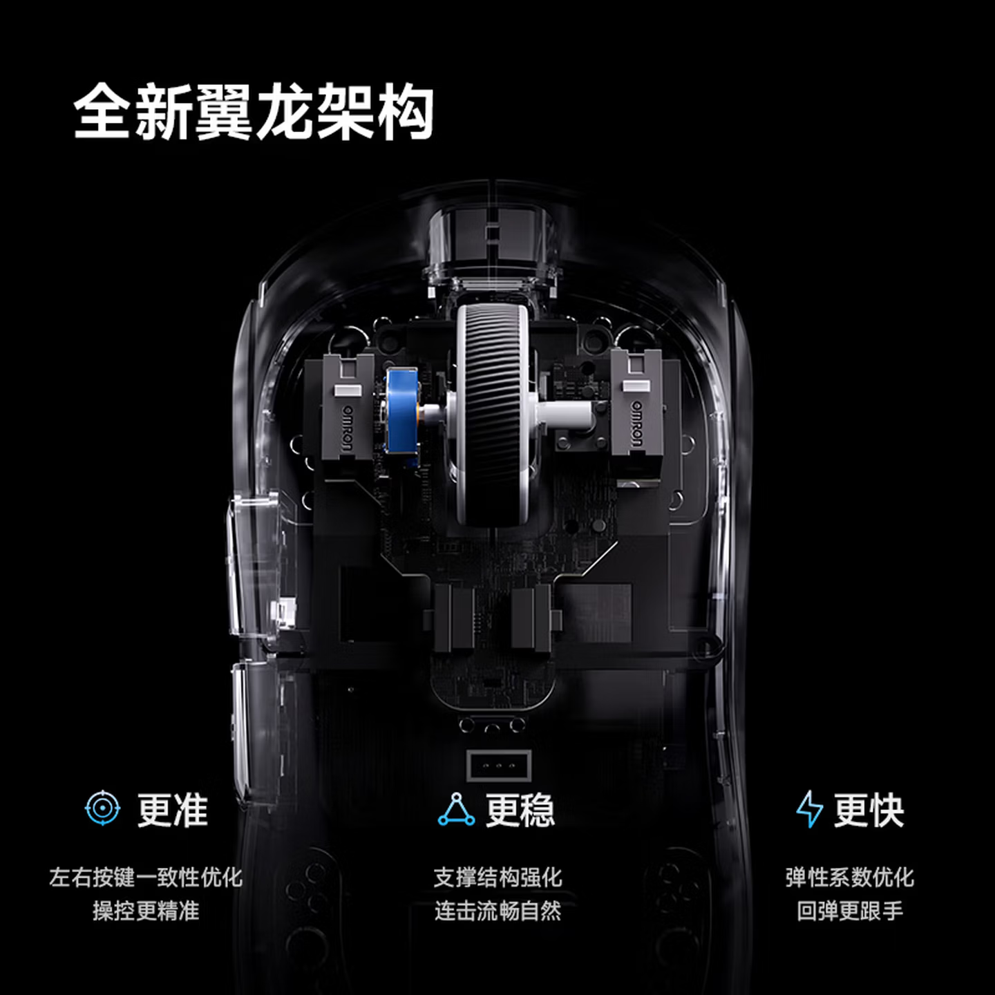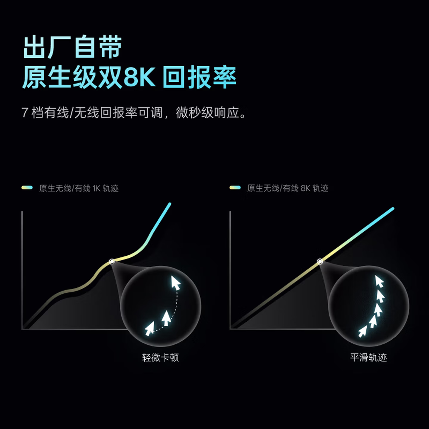 而在最重要的性能方面,Realtek旗舰主控芯片,采用PAW3395旗舰传感器,26000DPI可调,650IPS追踪速率,50G加速度;标配8KNano接收器,有线无线双8K回报率,延迟低到几乎无感;欧姆龙1亿次微动开关,声音清脆回弹快,内部翼龙架构让左右键一致性大幅提升;TTC金轮,刻度感大大增强。