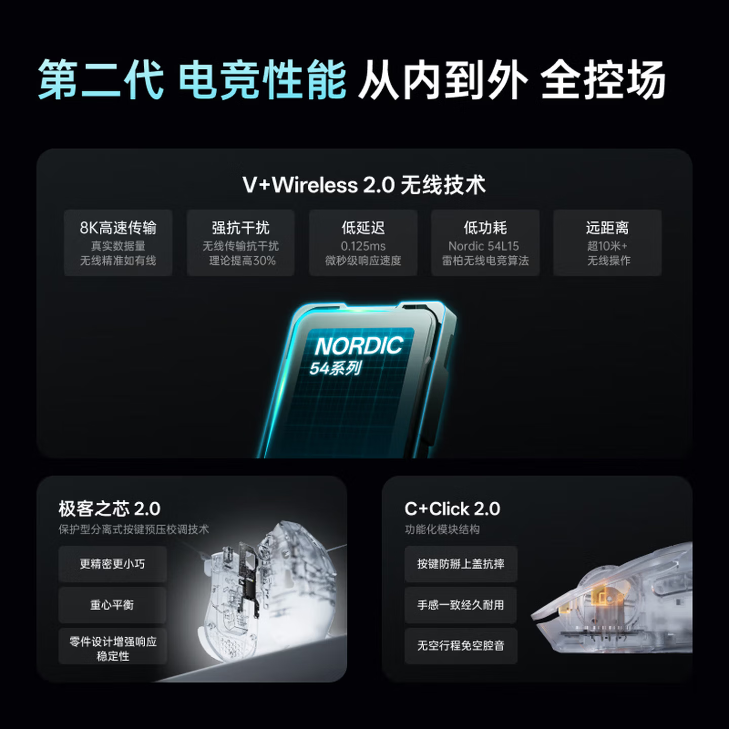 性能方面联合职业选手深度研发,可称之为点射之神。采用Nordic 54L15旗舰主控,可做到800毫安电池,约700小时的超长续航,按键延迟低至0.175ms,标配8K Nano接收器,再加上PAW3950 extreme特调传感器,50-30000可调,超频可达42000DPI,0.7/1.0/2.0mm三档LOD可选;VGN特调凯华1.6亿次光微动,再加上超神MVP竞技固件,将全面极限释放两款硬件性能。