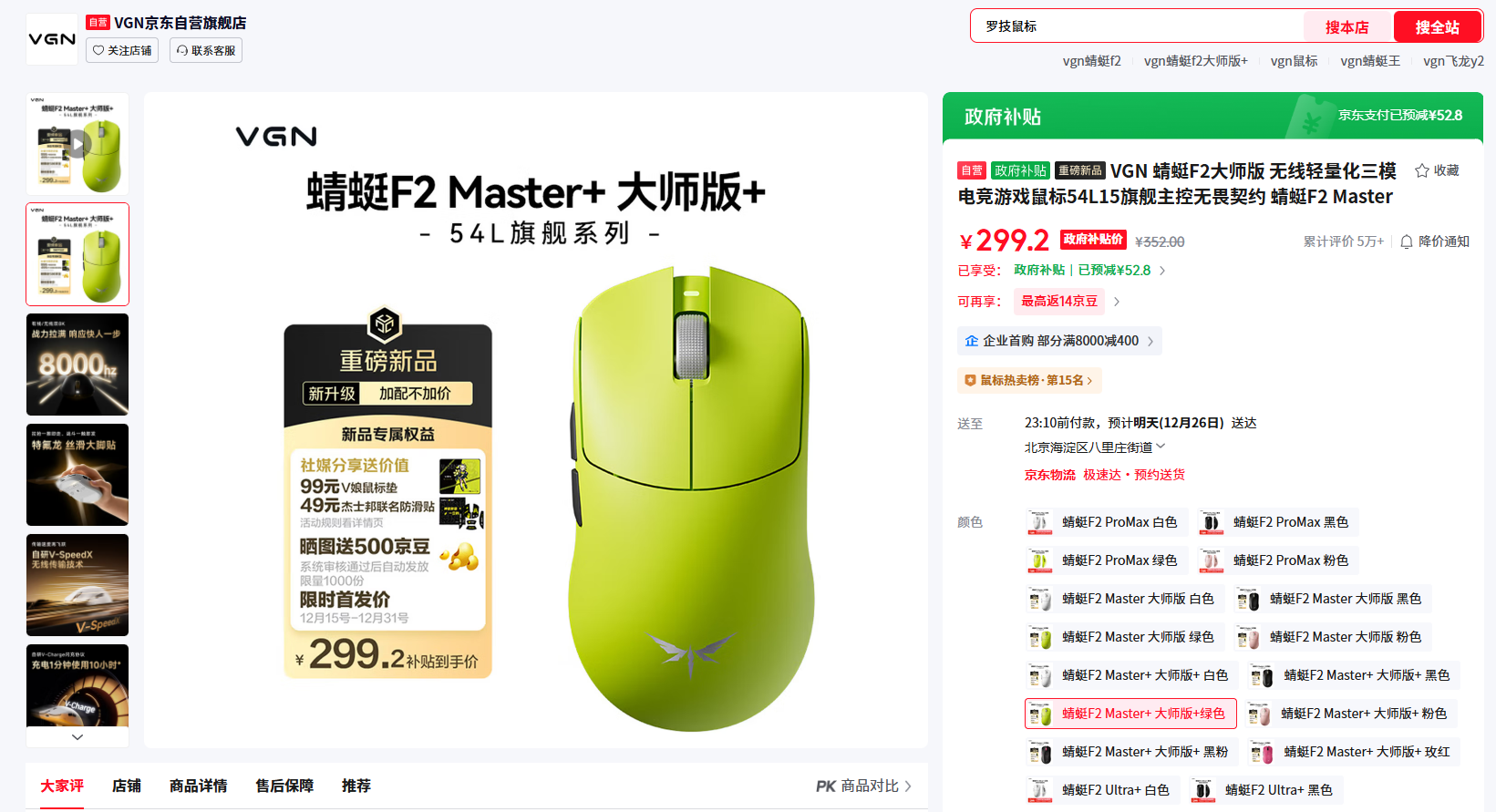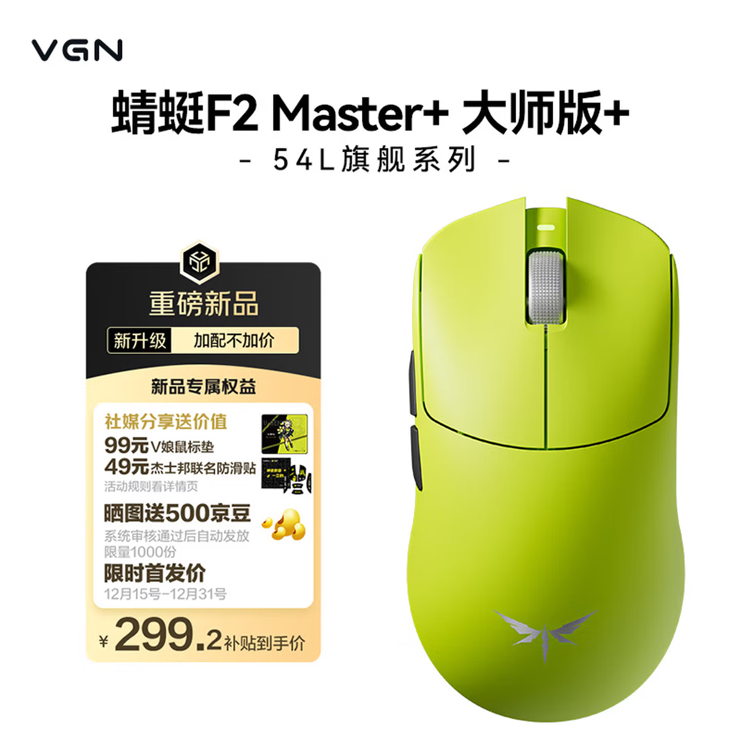 VGN蜻蜓F2 Master+是VGN蜻蜓F2系列的顶配版本,定位为旗舰级轻量化游戏鼠标,适合FPS竞技游戏玩家,颜值与实力双双在线。整体尺寸为122.4×65.1×38.3mm,重量约52克,内置800mAh超大电池,并支持自研V-Charge闪充技术,充电1分钟使用10小时,同时黑、白、粉、绿4种配色可选