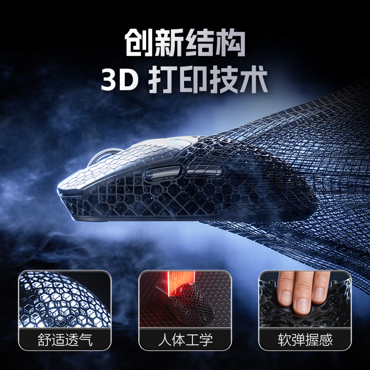 这款鼠标的核心特点就是采用创新3D打印工艺,外壳采用光敏树脂材料,通过3D打印工艺打造出仿生蜂巢状多孔透风结构,制成仿生蜂巢状多孔透风结构,具备优异的透气性和独特视觉效果。分区软硬度设计,在鼠标中部采用收腰设计配合按键引导槽,不同区域实现差异化握持手感,每一面都有不同收干,满足个性玩家的终极梦想,足够“个性化”。