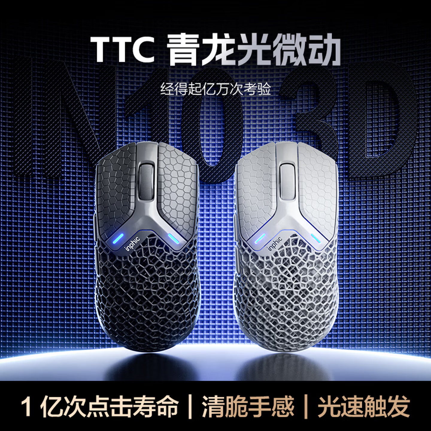 英菲克IN10 3D打印镂空版是英菲克于2025年12月19日发布的创新型游戏鼠标,采用全球首款3D打印镂空机身设计。整体尺寸为122.5×62×40mm,重量约72g,3D打印版本提供黑、白两种配色选择。支持有线USB-C、无线2.4G、蓝牙5.0三模连接,内置500mAh锂电池,随附1.8米带磁环伞绳编织线和8K Nano接收器。