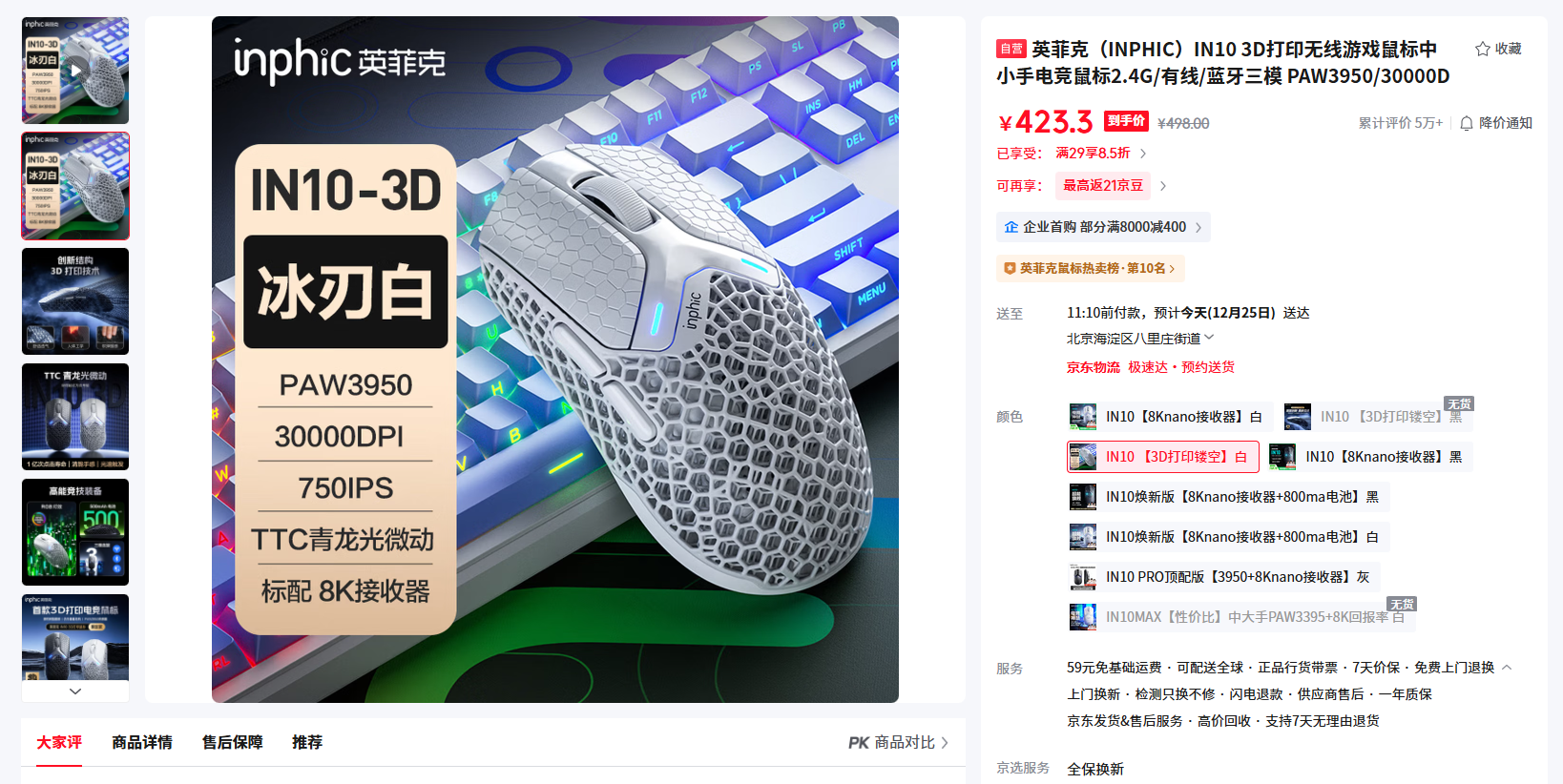 电商平台售价423.3元,相比普通版本贵出约224元,3D打印版本的重量也比普通版重约12g,预算敏感、追求轻量化的用户需慎重考虑,不过对于那些追求个性、外表独特的用户,这款鼠标绝对是一个不错的选择。