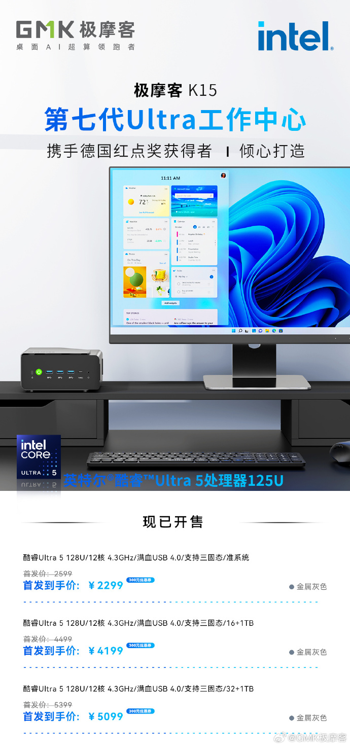 极摩客 GMK此前公布的NucBox K15迷你主机国行版现已上市。整体采用铝金属机身,尺寸为154×151×73.6mm,整体性能搭载英特尔酷睿 Ultra 5 125U处理器,12核14线程:2性能核+8能效核+2低功耗能效核,采用Intel 4工艺,最高睿频4.3GHz,配备12MB智能缓存。集成Intel AI Boost NPU,AI算力达21 TOPS。