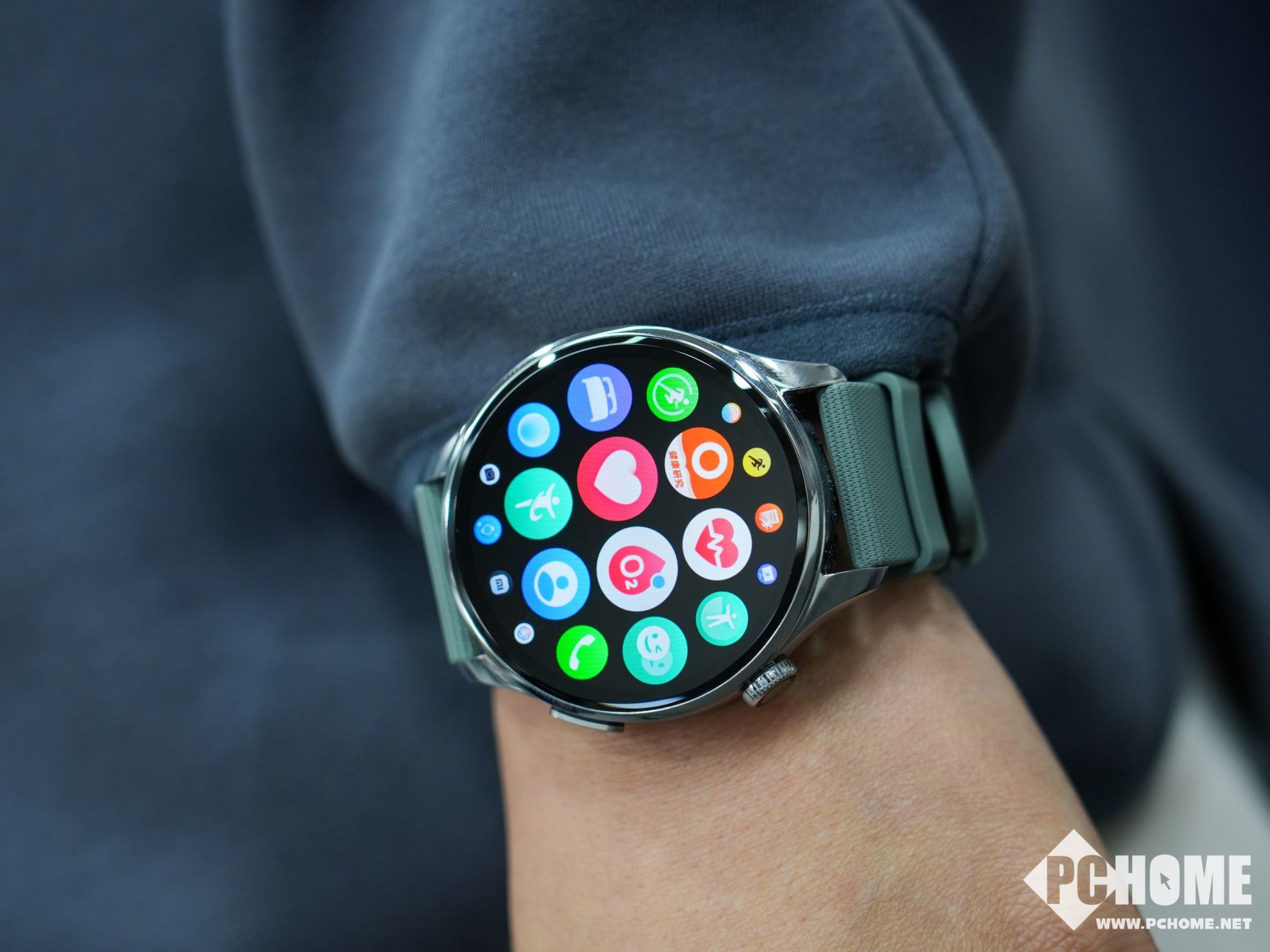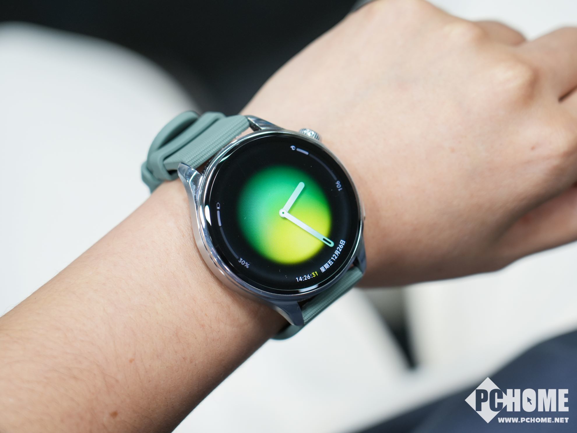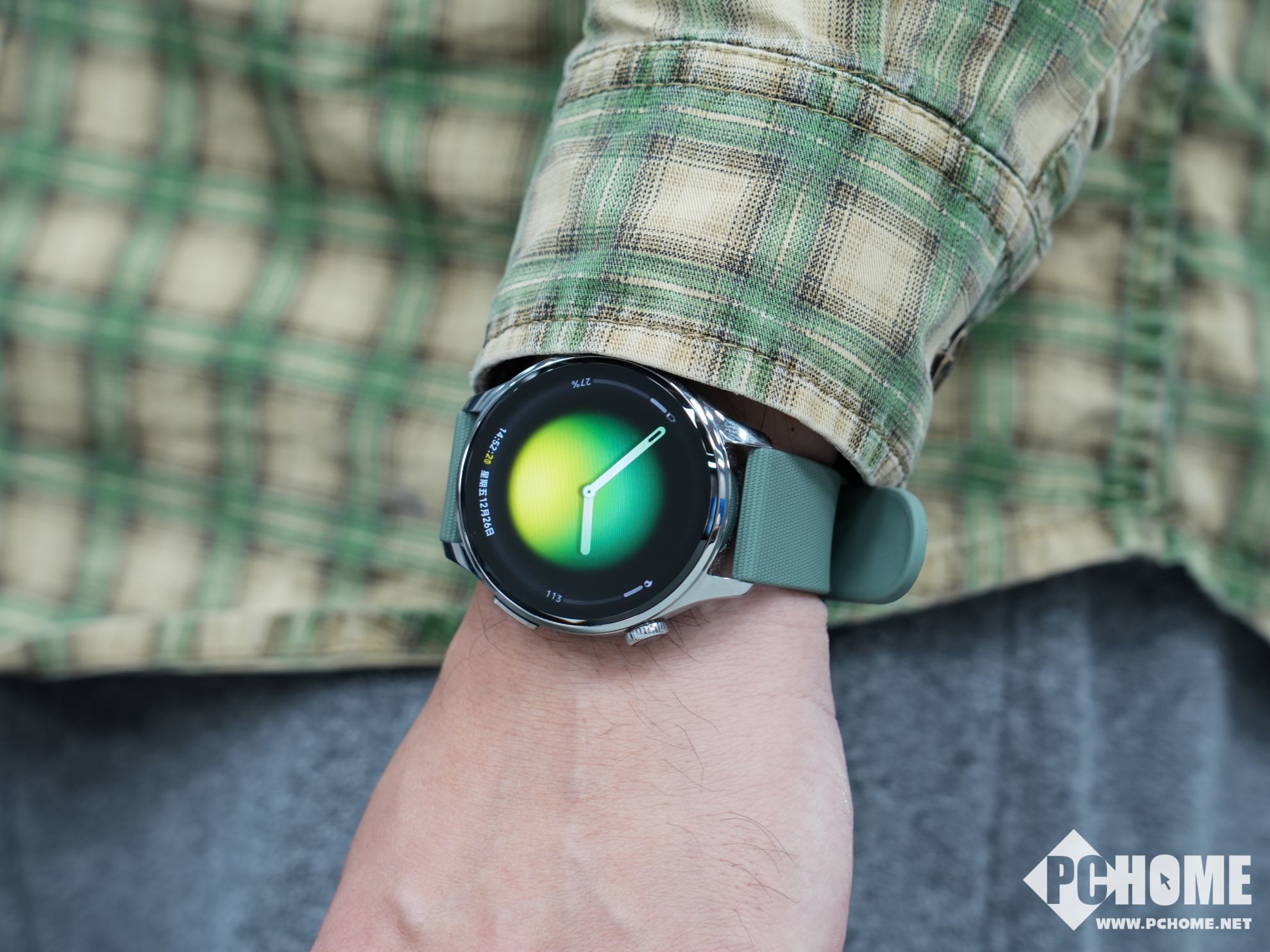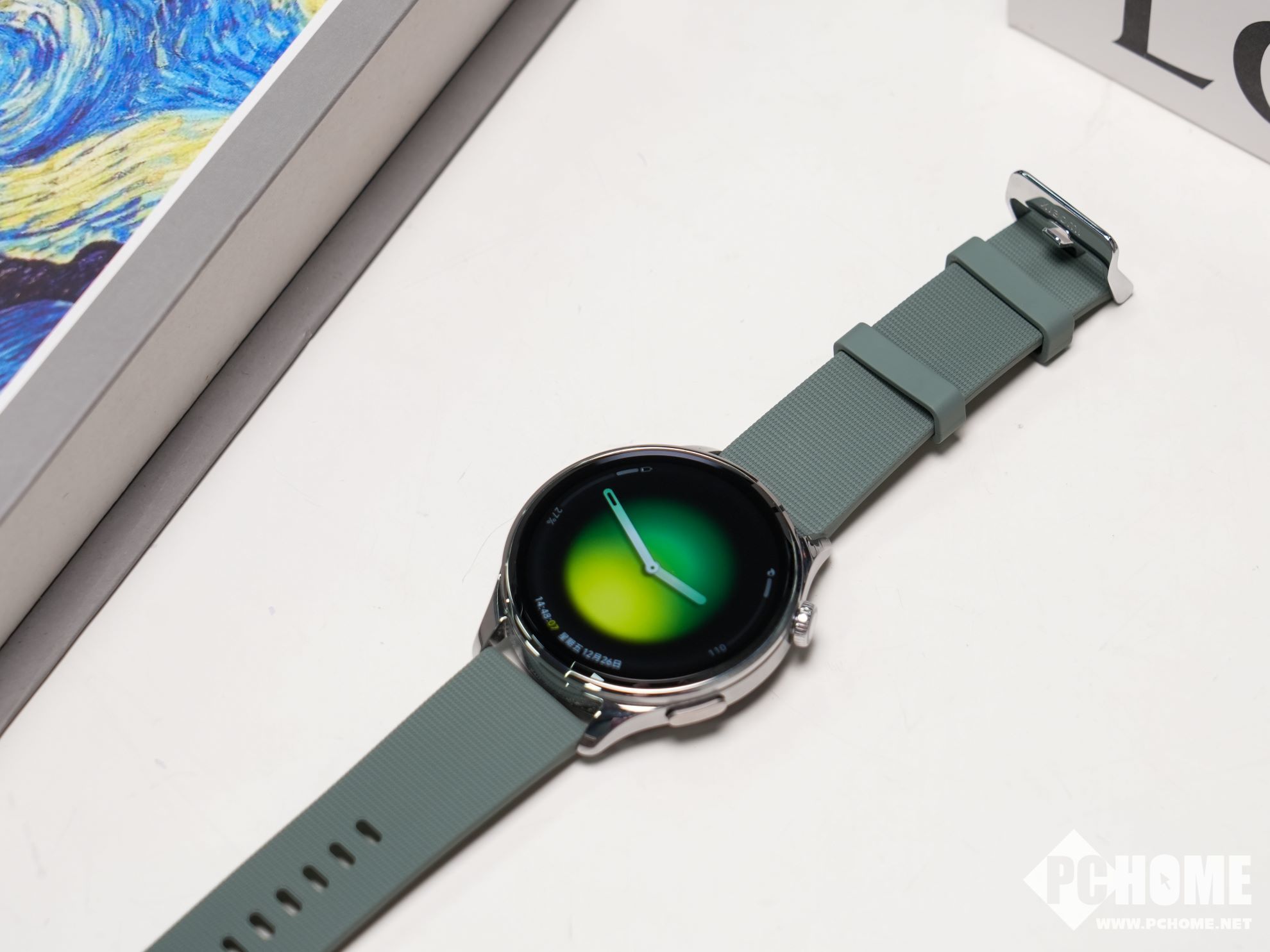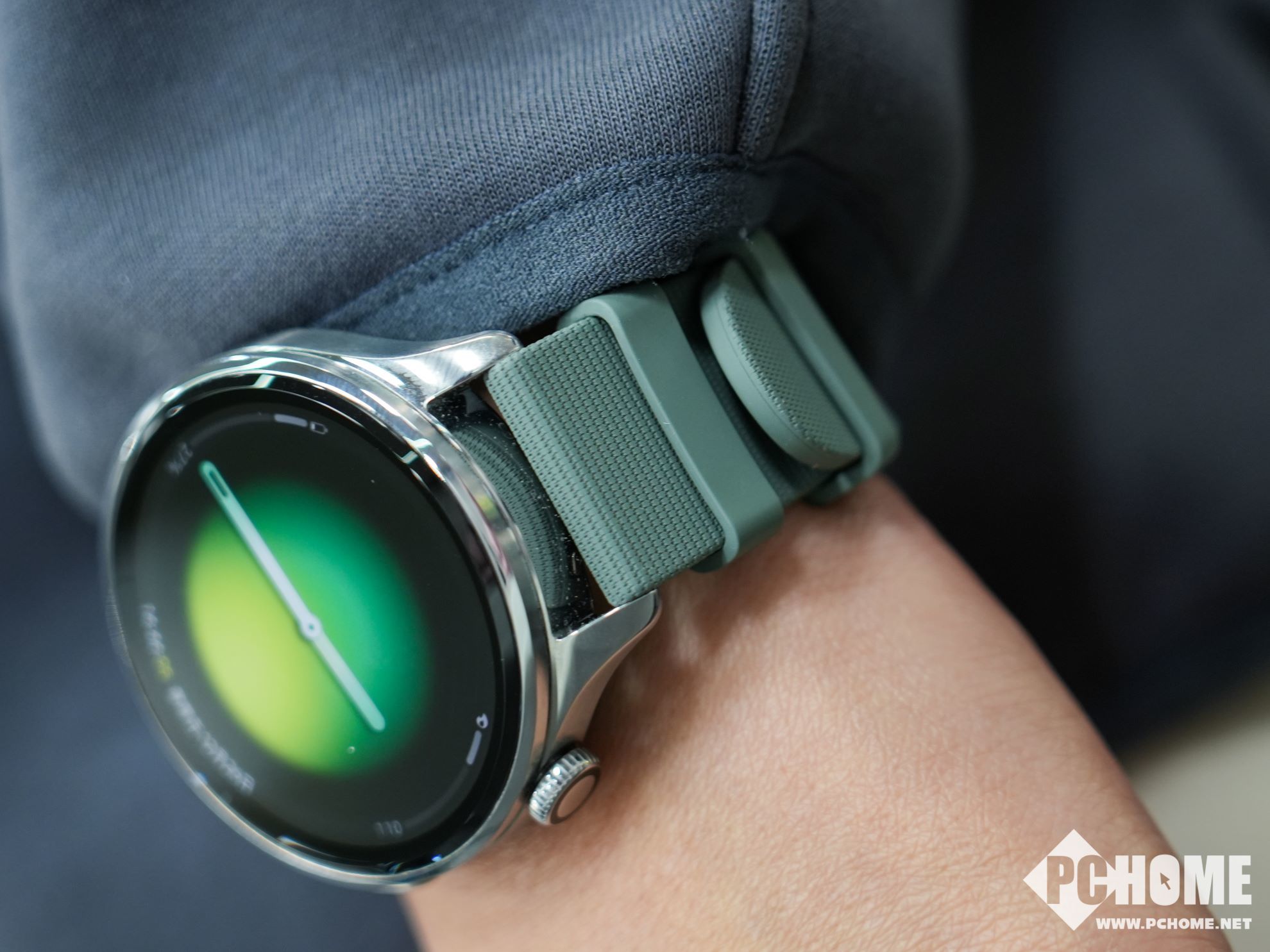 笔者佩戴的是卡其绿氟橡胶表带款,低饱和度配色表带在简约的同时还能成为手腕上一抹亮色,更显个性化,同时佩戴也更为轻巧。同时用户也可以根据需求选择真皮表带款式,包括金棕色以及柔雾蓝。