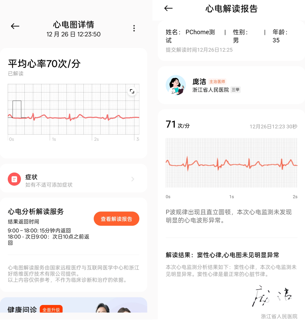 通过30秒的快速采集,小米Watch 5能精准提取有效心电信息,并会生成专业的心电图报告,在心电图详情中我们还能添加自己的不适症状。小米Watch 5系列提供了专业医师解读服务,在解读报告中能看到医生对心电图的分析,便于用户对自己的心脏健康情况有一个基本的了解。