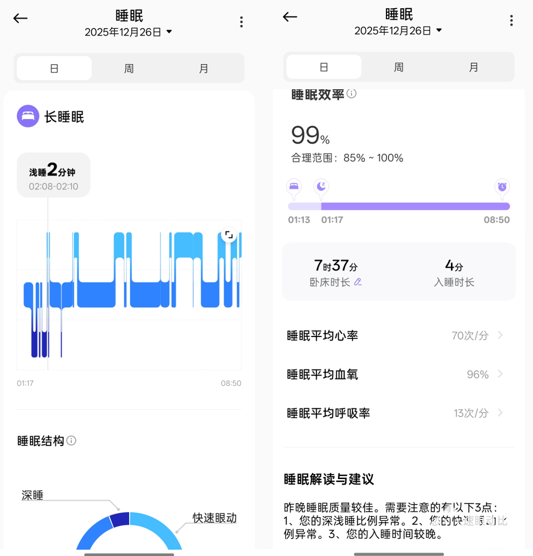其中睡眠监测与分析联手了专业机构,为用户改善睡眠质量。在睡眠报告中除了睡眠时长、睡眠结构、睡眠效率之外,还能看到睡眠解读与建议。