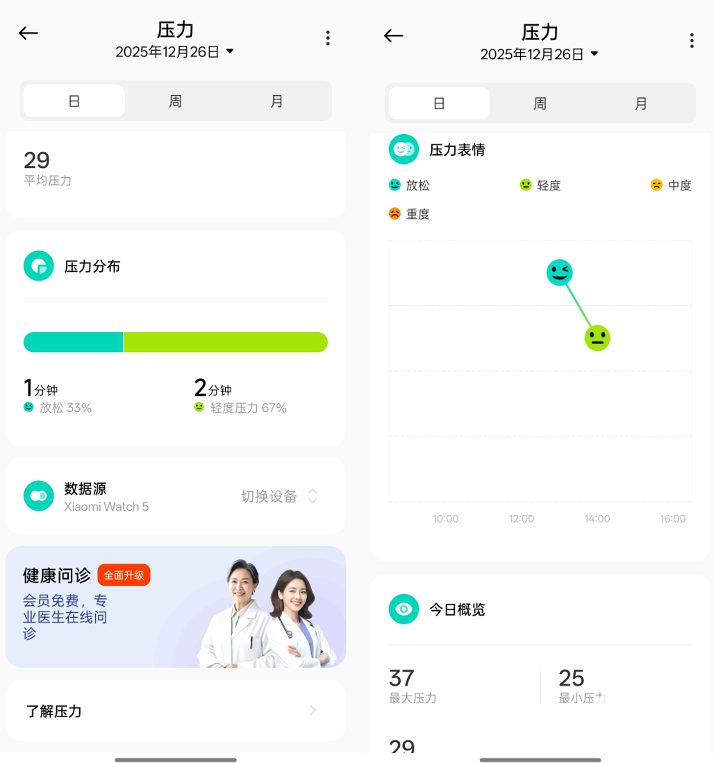 目前很多朋友对于生活和工作有比较大的压力,可以开启全天压力监测,压力持续过高的时候会主动提醒放松。