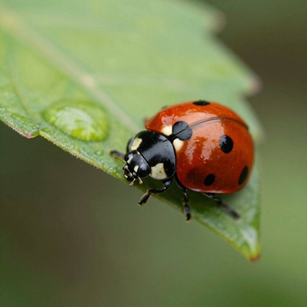 (提示词:微距视角,一只瓢虫停留在绿色叶片边缘,翅膀纹理清晰,水珠附着在叶脉上,背景完全虚化,超高细节微距摄影)