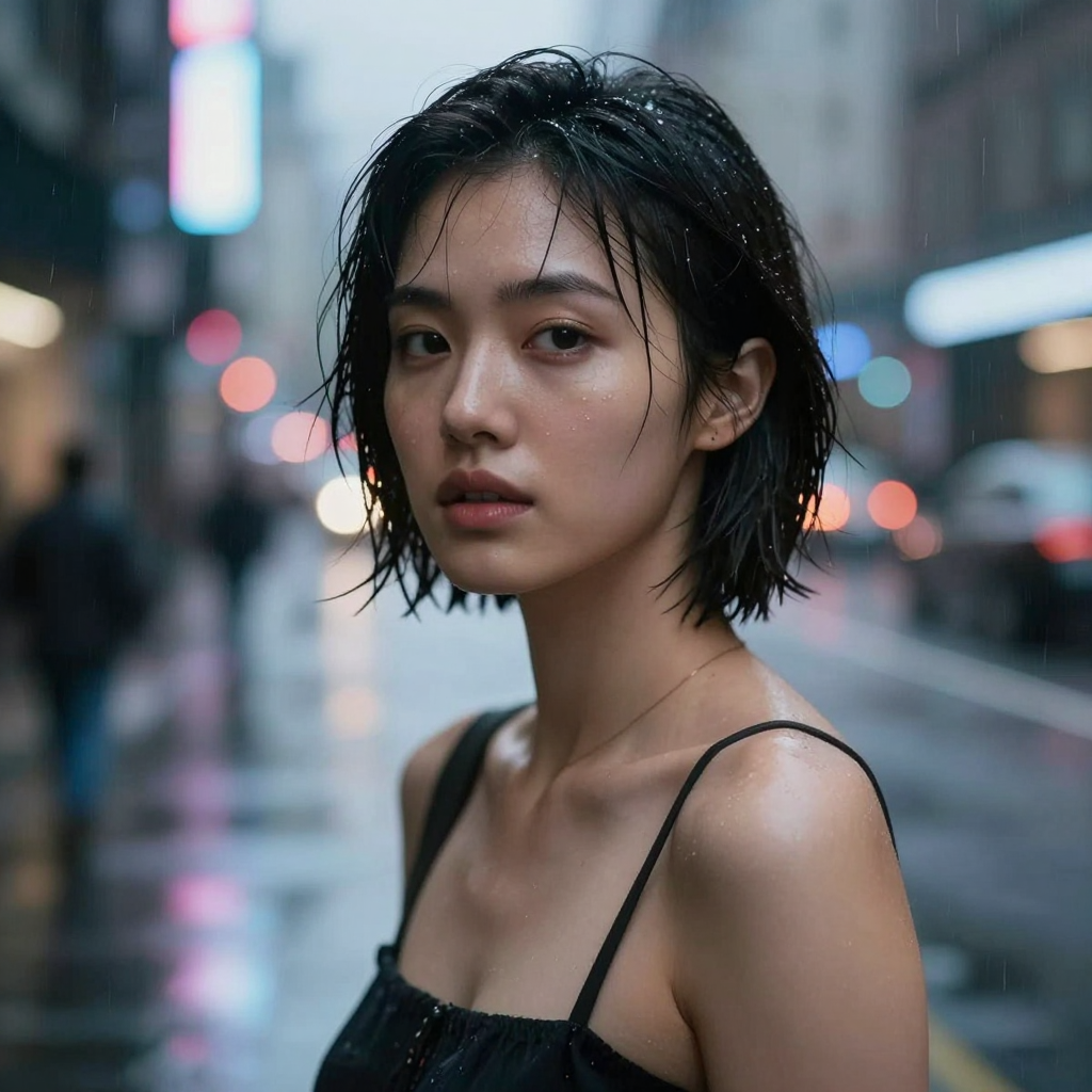 (提示词:一位短发女性站在雨后的城市街头,皮肤细节真实,发丝微湿,霓虹灯光在背景中形成散景,雨水倒影映在地面,电影感构图,超写实人像摄影)