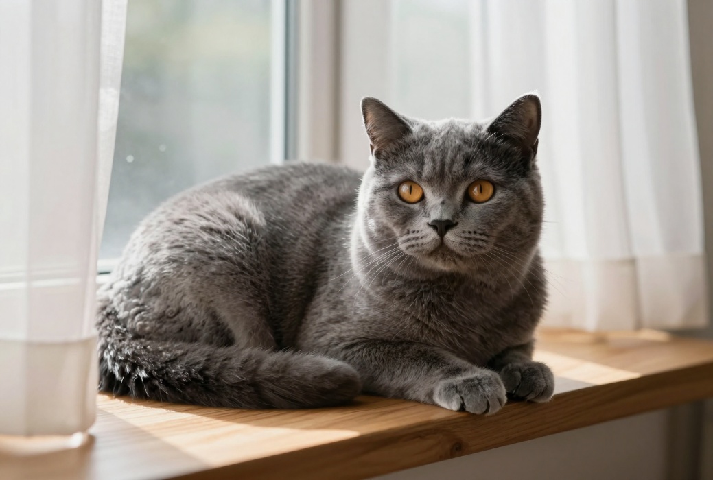 (提示词:一只英短蓝猫蜷缩在落地窗旁的木质窗台上,柔和的午后阳光透过白色纱帘洒在猫咪毛发上,毛发细节清晰可见,眼睛呈现琥珀色高光,环境安静温暖,电影级色彩)