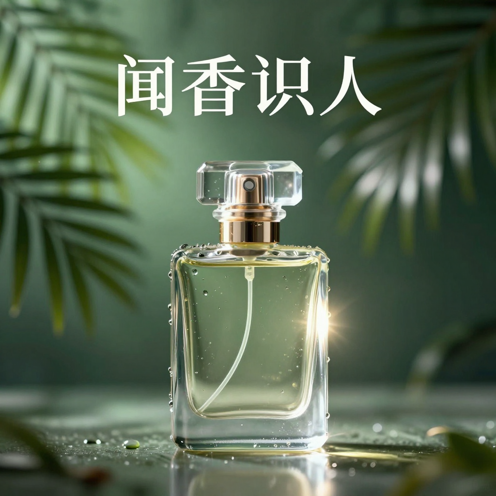 (提示词:一张商业海报,精致的玻璃香水瓶子位于画面中央,背景是绿色的棕榈背景,带有浅景深虚化效果,香水瓶上有露珠,氛围梦幻精致,8K级清晰度)