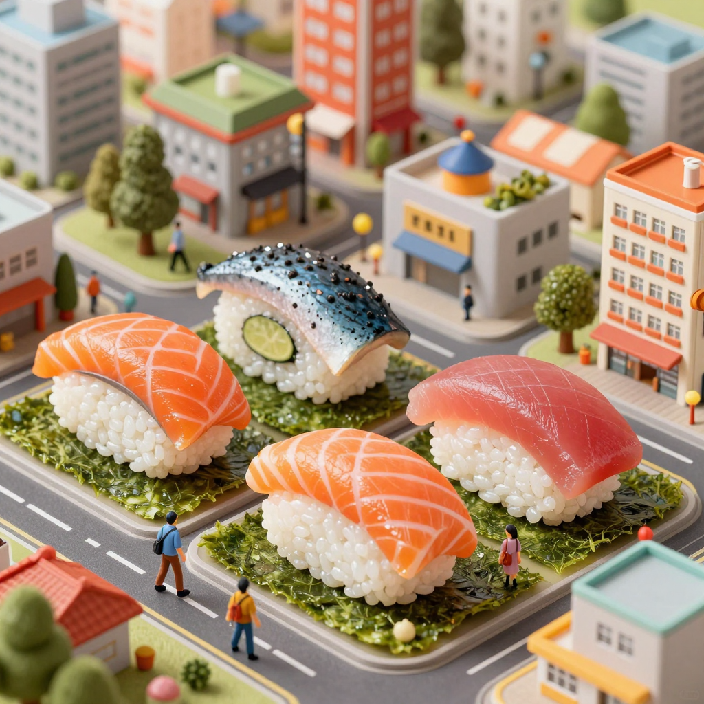(提示词:一座寿司城市,建筑由三文鱼、金枪鱼和米饭构成,旁轴摄影,道路是海苔,人物像玩偶般在城市中行走,色彩鲜艳,细节丰富,童话感,高分辨率插画)