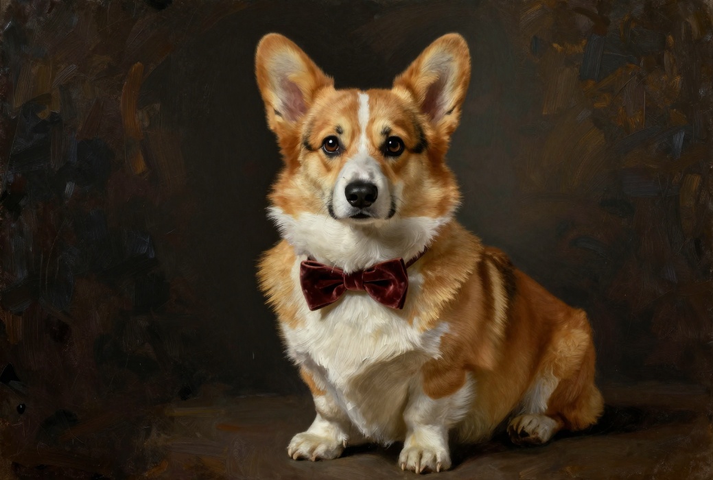 (提示词:欧式古典油画风格,一只表情庄重的柯基犬端坐在深色背景前,佩戴复古丝绒领结,厚重油画笔触,文艺复兴时期肖像构图,质感强烈)