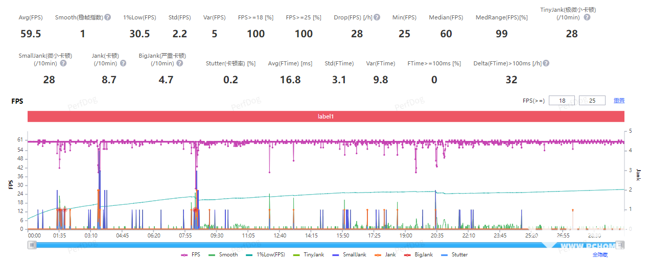 我们以鸿蒙版《原神》为例进行实测,在极高画质设置下,进行30分钟跑图+打怪综合测试,全程通过专业软件PerfDog监测数据。结果显示,全程平均帧率达59.5帧,表现稳定;尤其后半程帧率波动极小,展现出优异的长时间稳帧能力。