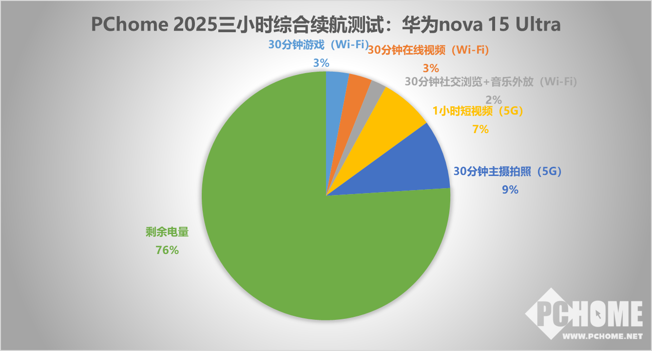 续航方面,华为nova 15 Ultra配备6500mAh大容量电池,较上代增加1000mAh,电量提升显著。3小时续航实测后剩余电量76%,较上代提升6%,续航实力扎实。理论续航时间超12小时。除了续航持久,该机还支持100W有线快充与50W无线快充,充电方式灵活便捷,彻底告别电量焦虑。