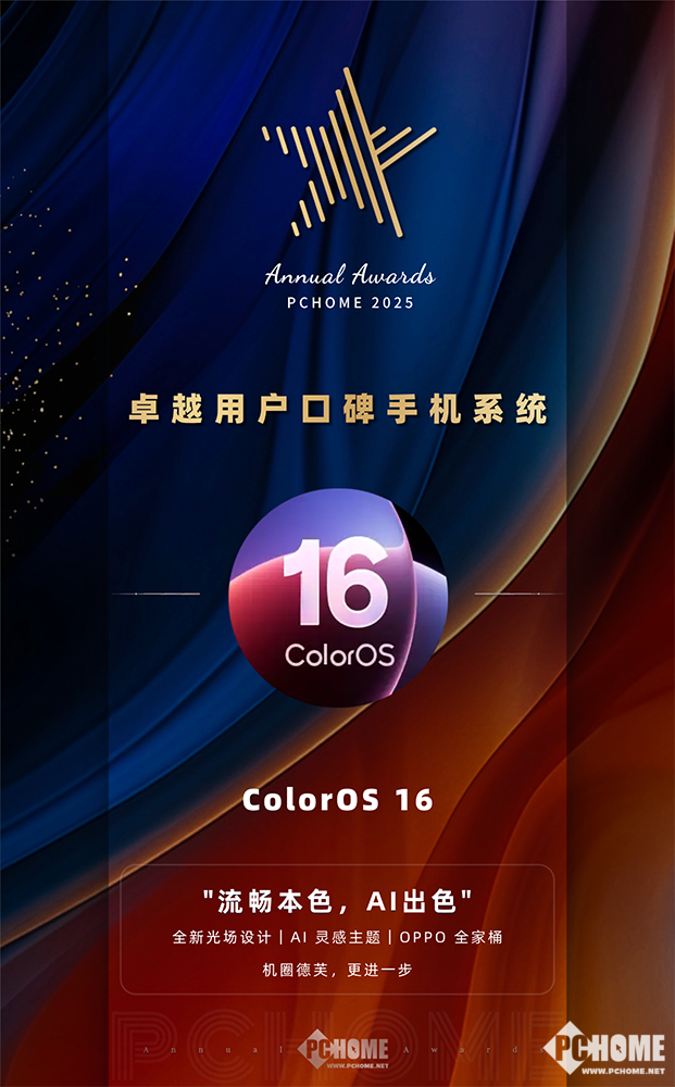 PChome年度卓越产品评选已经落下帷幕,2025年度共有数十款产品脱颖而出,获得年度奖项。在本次评选活动中,ColorOS 16系统获得PChome2025卓越用户口碑手机系统奖项。