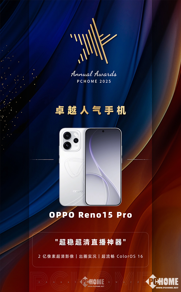 PChome年度卓越产品评选已经落下帷幕,2025年度共有数十款产品脱颖而出,获得年度奖项。在本次评选活动中,OPPO Reno15 Pro获得PChome2025卓越人气手机奖项。