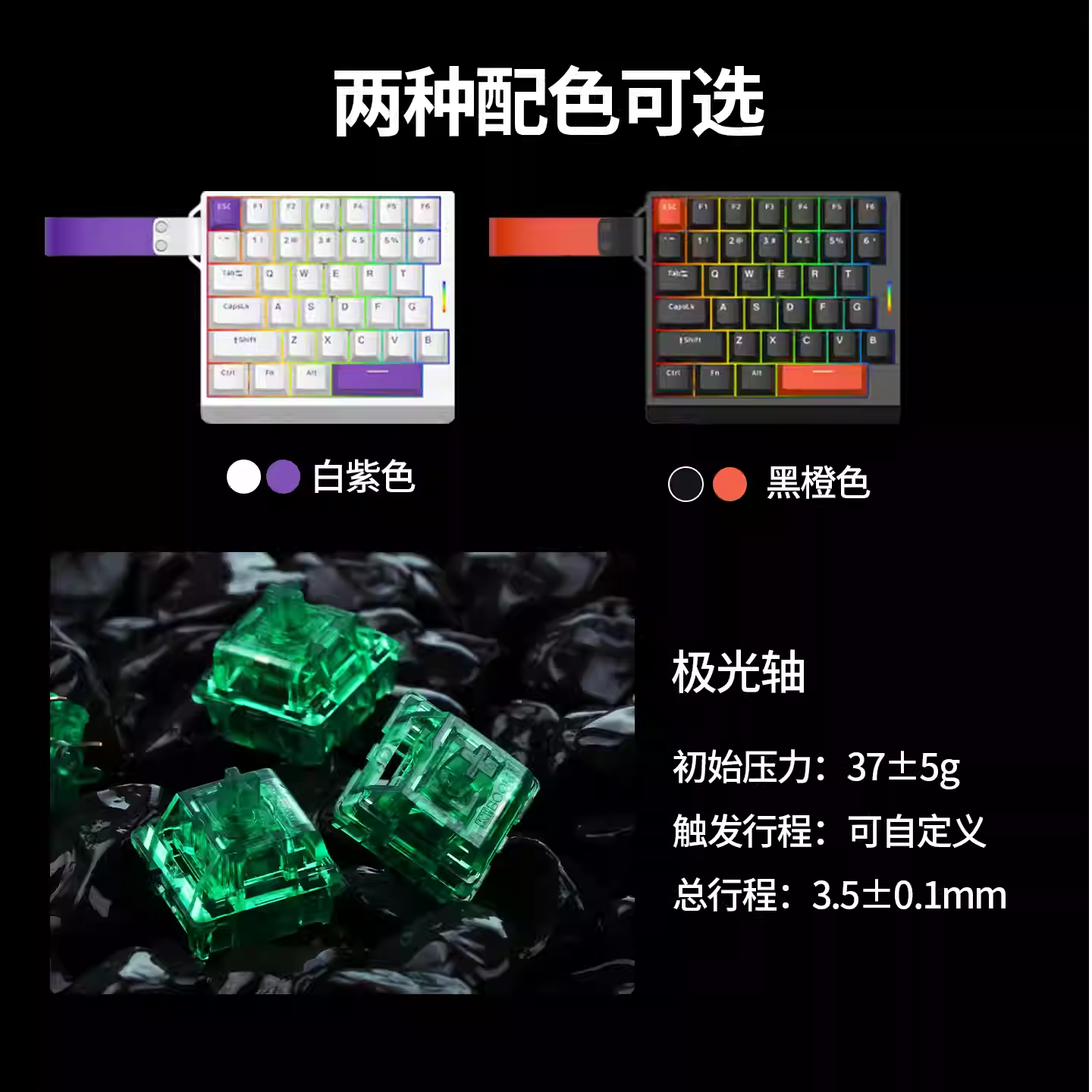 这款键盘采用超精简布局与设计,36键30%配列,仅保留核心游戏按键,外壳为晒纹ABS塑料,搭配可拆卸飘带装饰。提供白底紫键、黑底橙键两种配色方案,右侧配有RGB灯效竖线指示灯。