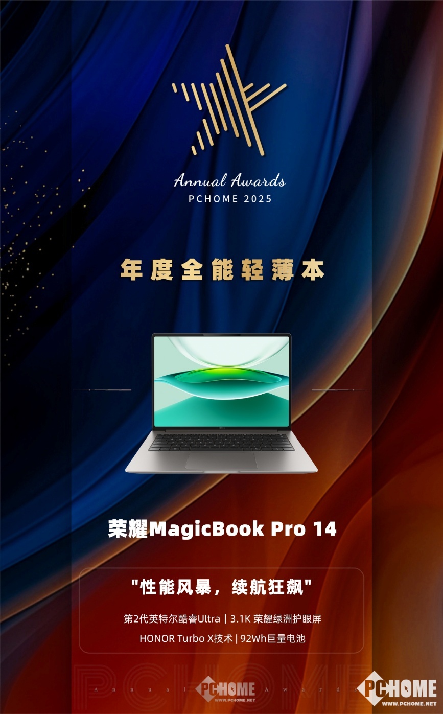 PChome年度卓越产品评选已经落下帷幕,2025年度共有数十款产品脱颖而出,获得年度奖项。PChome始终恪守严谨、公平、公开、公正、客观、专业的媒体底线,为广大网友甄选优秀产品,这是我们的使命,也是我们的立身之本。在本次评选活动中,荣耀MagicBook Pro 14获得全能轻薄本奖项。