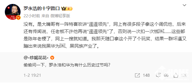 或许这只是罗永浩的临场发挥,但被不少网友过度解读,甚至有网友询问,罗永浩是不是与华为有什么过节。