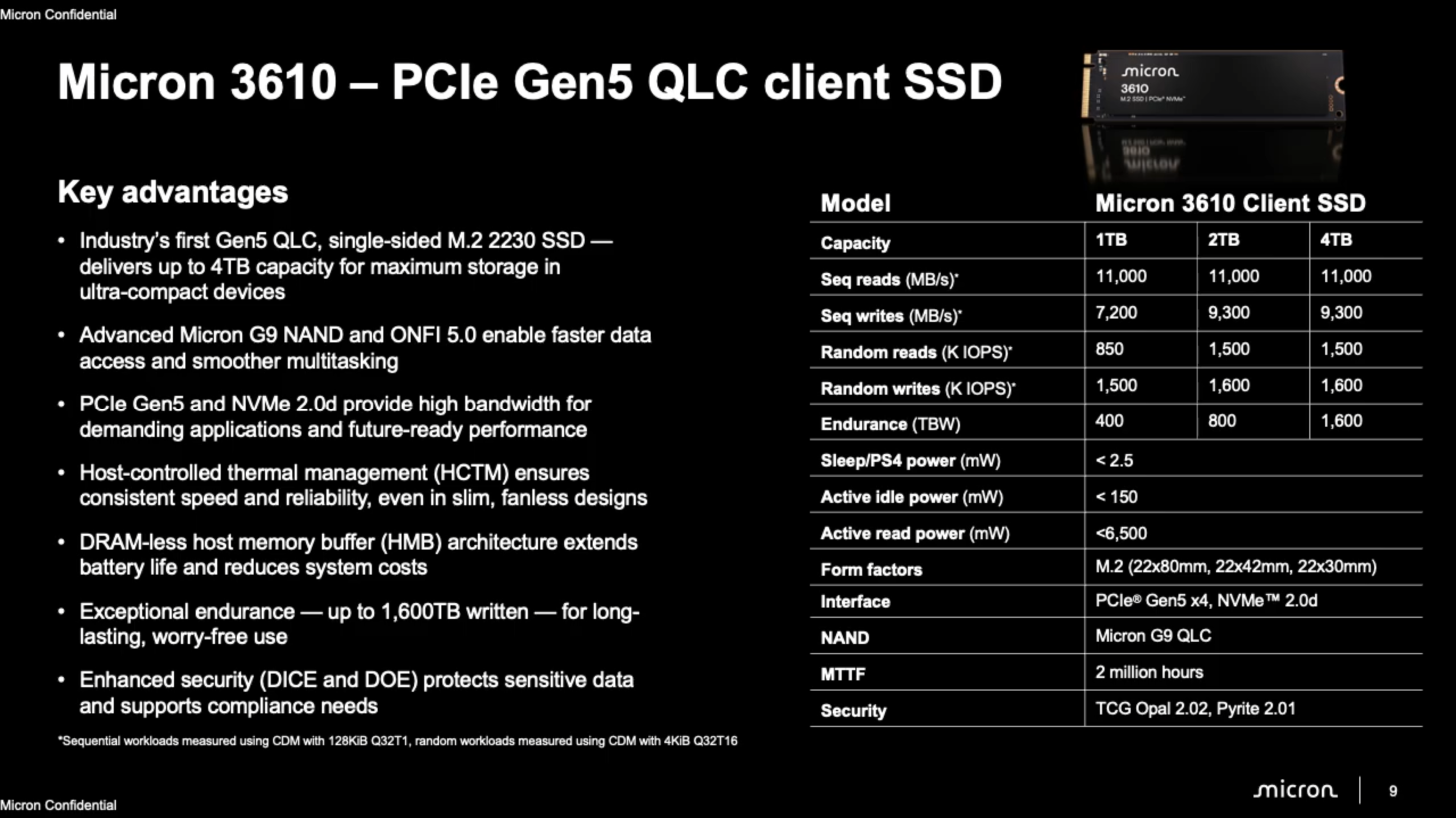 基于美光成熟的G9 NAND闪存技术打造,3610系列固态硬盘顺序读取速度达11,000 MB/s,写入速度9,300 MB/s,支持160万IOPS随机读写性能,较前代产品每瓦性能提升超40%。提供1TB、2TB、4TB三种容量,覆盖M.2 2230、2242、2280三种外形规格,其中M.2 2230单面设计为超薄笔记本和无风扇设备提供高兼容性。首次将PCIe 5.0接口与美光G9 QLC NAND闪存结合,专为AI多任务处理、流媒体及生产力场景优化。
