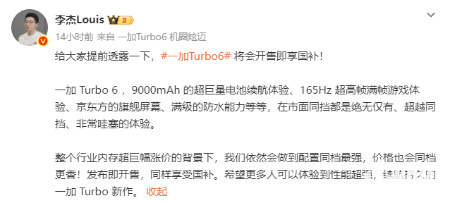 一加李杰透露,整个行业内存超巨幅涨价的背景下,我们依然会做到配置同档最强,价格也会同档更香!一加Turbo 6发布即开售,同样享受国补。