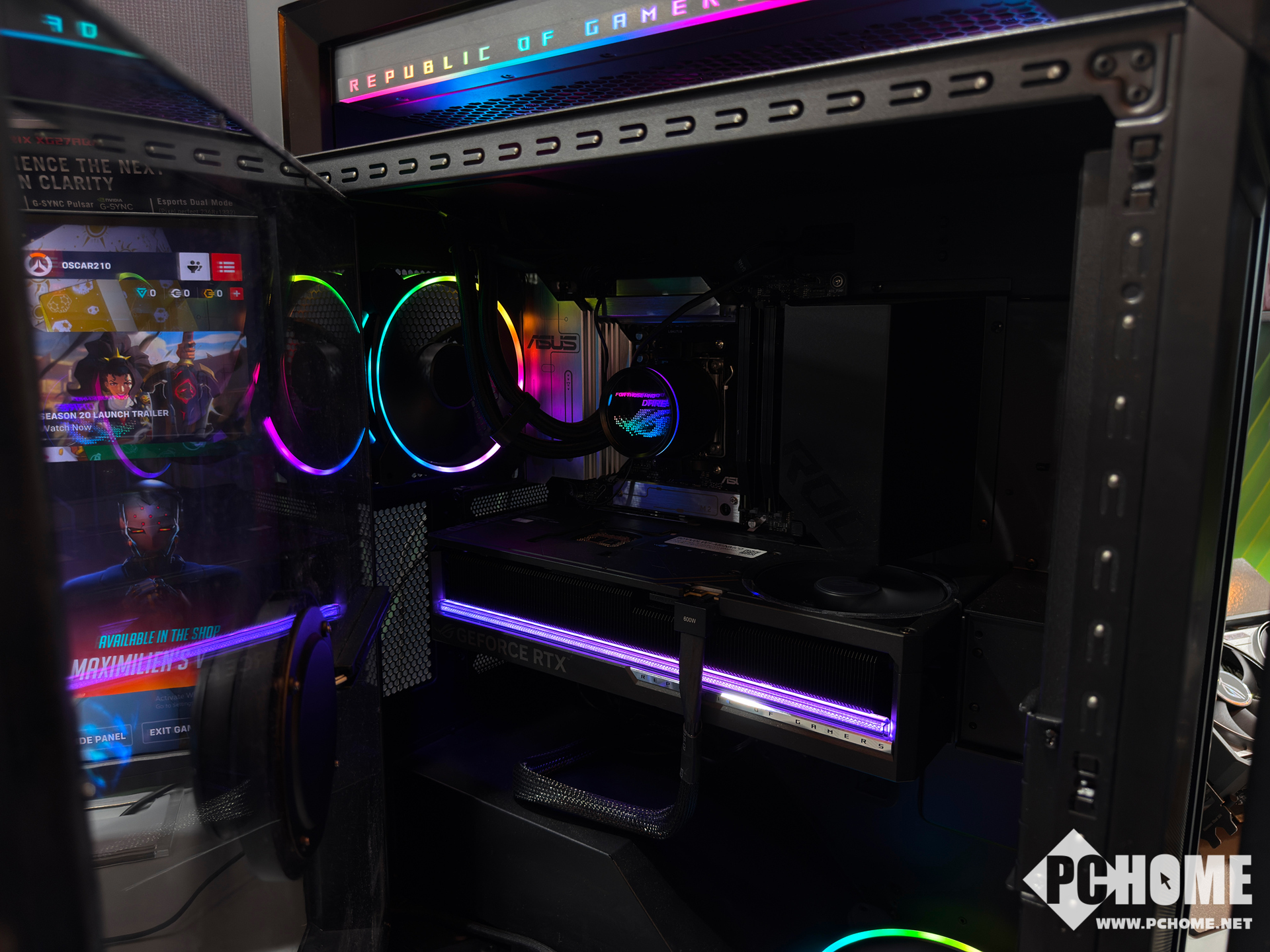 采用104L ATX超级塔式机箱,大幅增强内部散热空间,支持更高规格散热配置,方便后续维护,其中风扇支持一键开启增强模式,玩家还可通过奥创智控中心和神光同步,对显卡、风扇、水冷头、AniMe Holo全息风扇的RGB灯效进行调节,打造极具视觉冲击力的高性能游戏台式机。