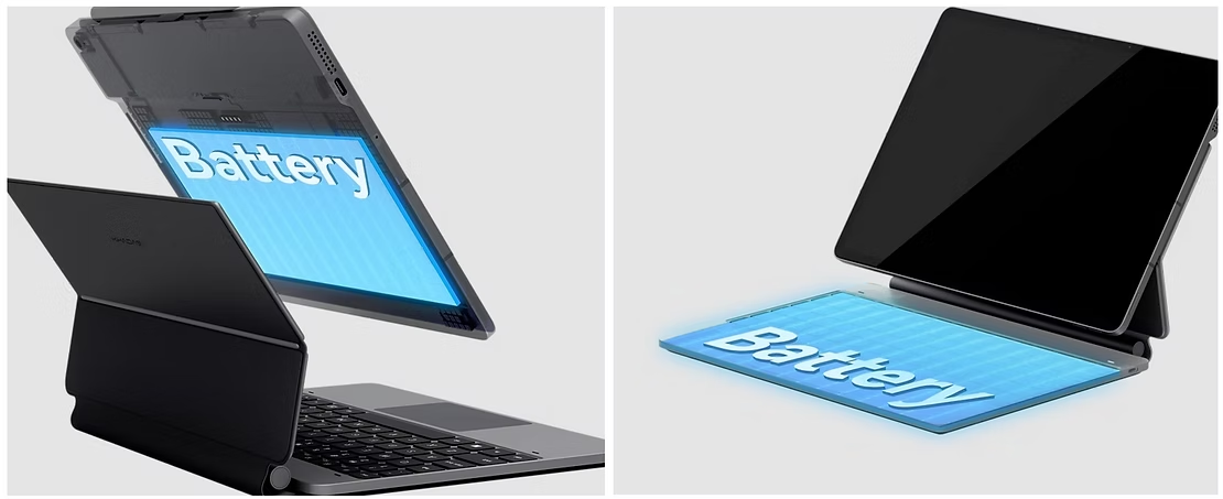笔记本形态只需将平板嵌入带触控板的专属键盘模块即可实现。同时该键盘模块内置独立电池,与平板本体组合后总电池容量可达45Wh,支持9小时本地视频连续播放。这种双电池叠加设计,弥补了平板的续航短板,实现1+1>2的续航效果,大幅提升移动办公时长;